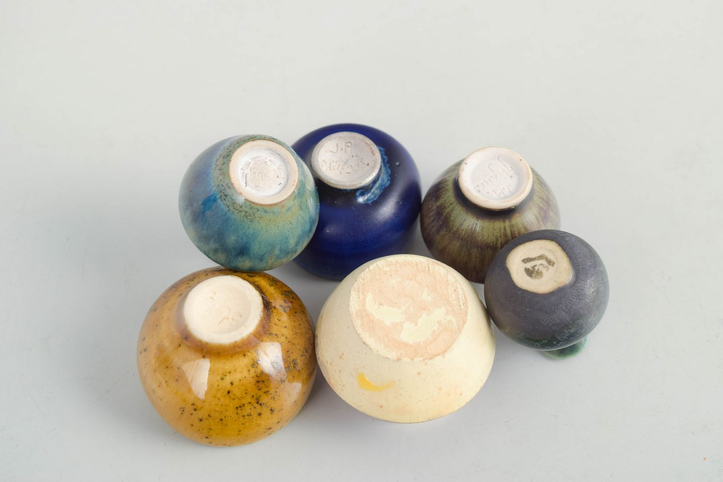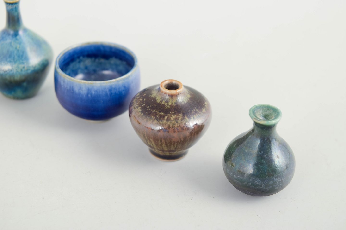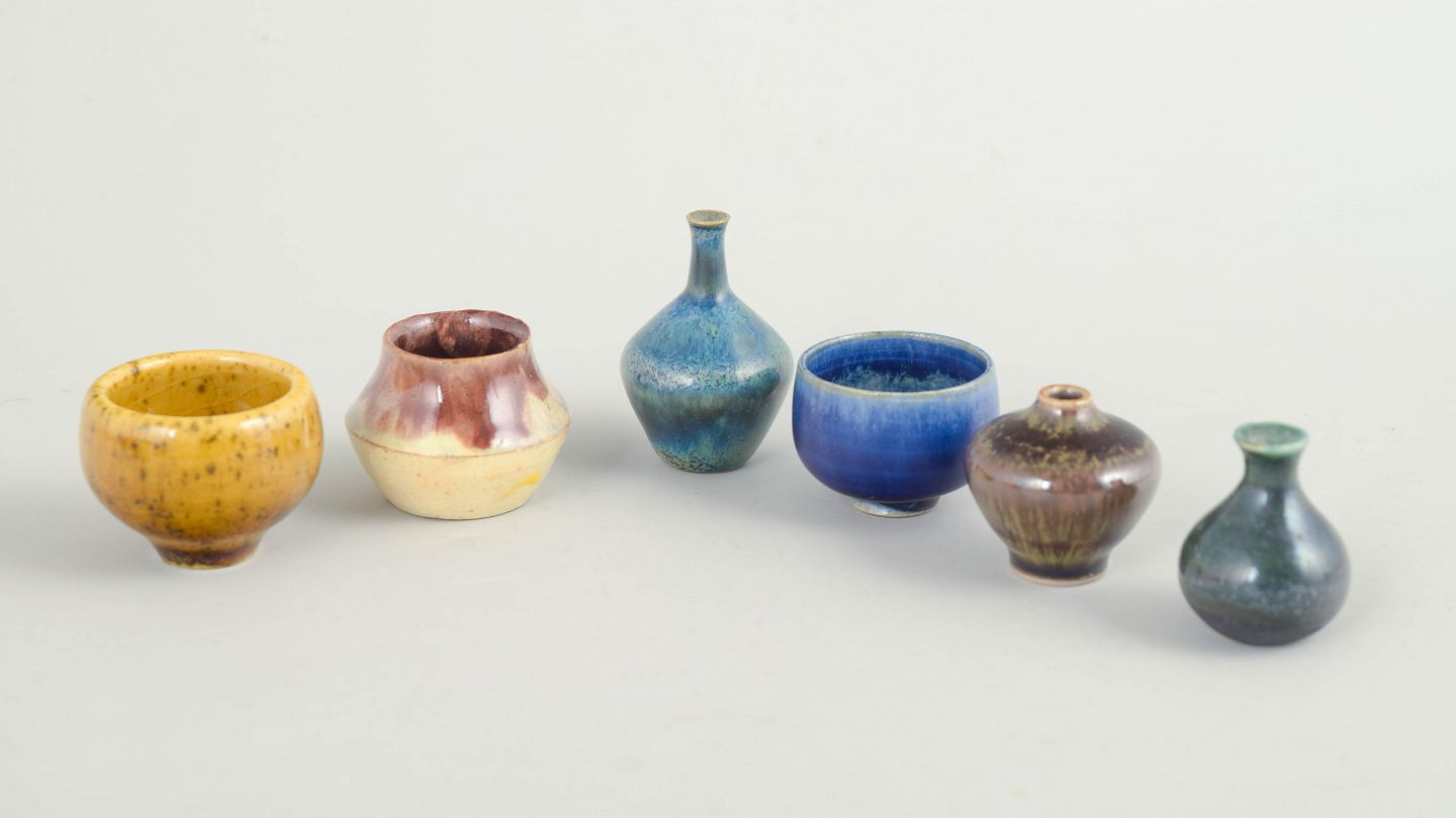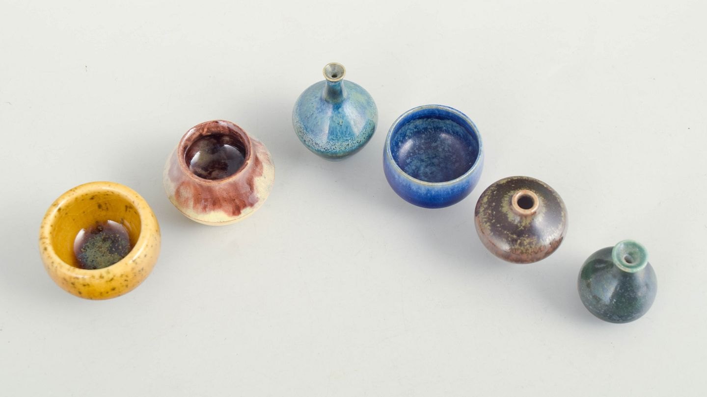 Sæt af seks miniature skåle og vaser i keramik.Samling af seks miniature keramikgenstande bestående af små skåle og vaser i forskellige former og glasurer. Fremstillet i keramik med flerfarvede glasurer i blå, brune og gule nuancer. Tre eksemplarer er fra Höganäs og andre fra forskellige producenter.