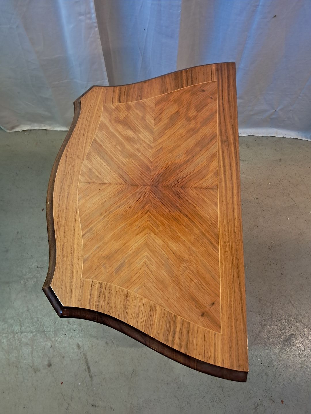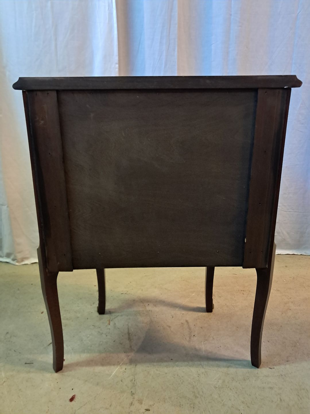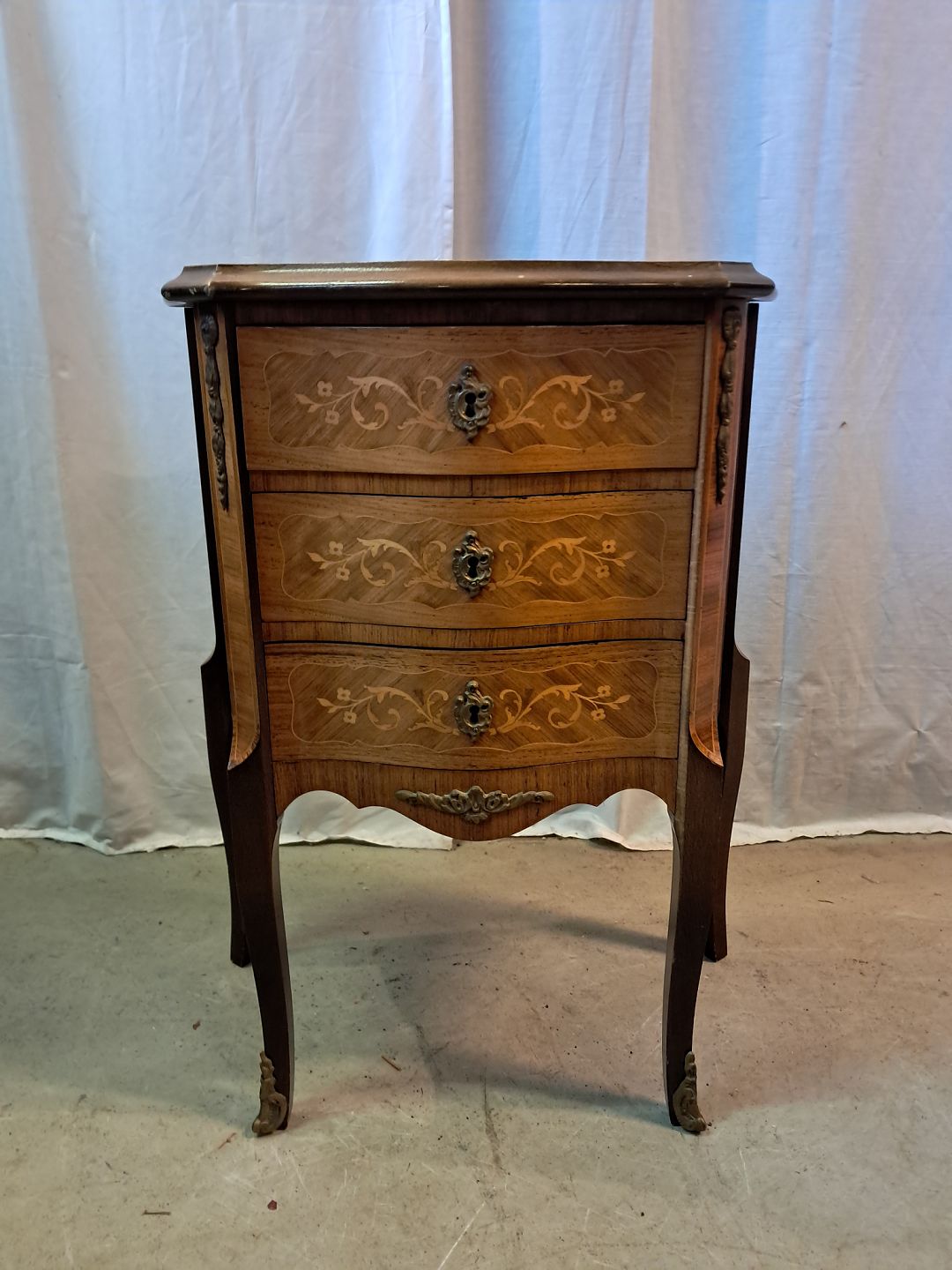 Kommode i fineret mahogni med intarsia, fra 1980erne.Den har brugsspor.