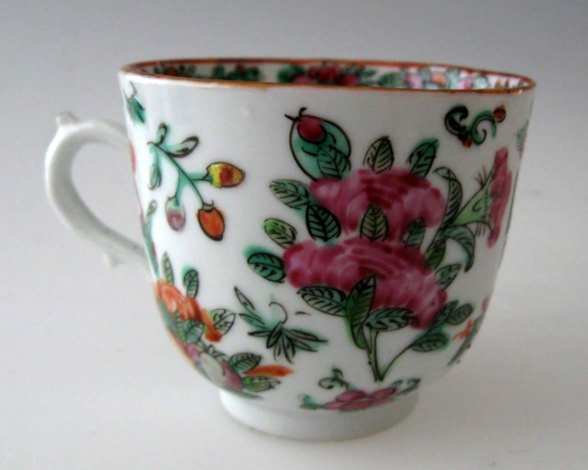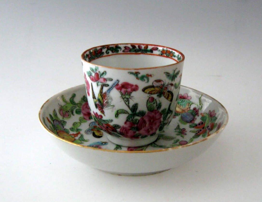 Famille rose kop, Kina, 19. årh. Med underkop. Polykrom dekoration med roser, fugle og insekter. Højde kop.: 6,5 cm. Dia. skål: 13 cm.Emne nummer: 5601