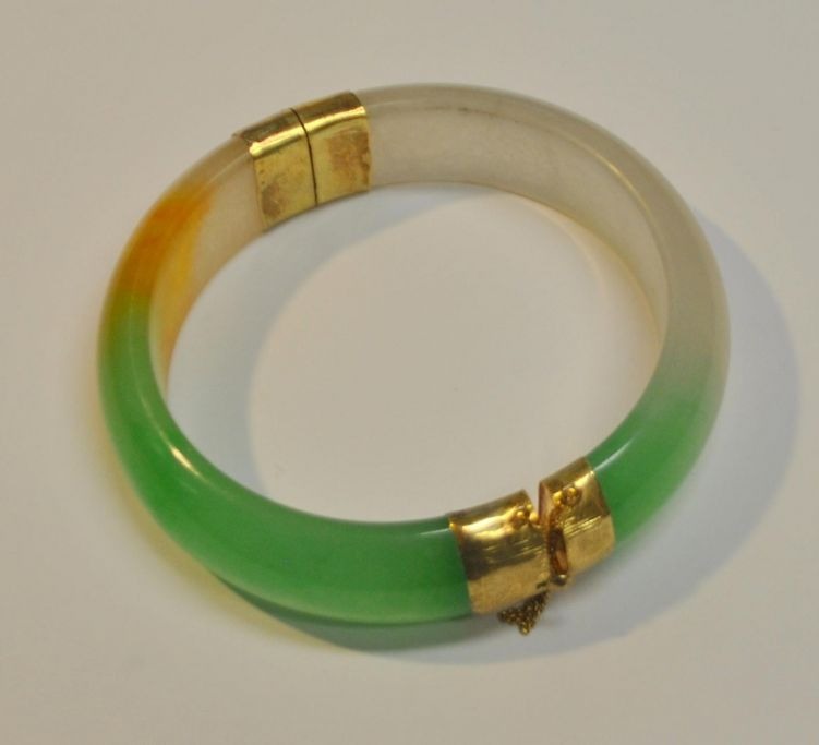 Kinesisk jade armbånd, 20. årh. Med guld lås i 8 K rødguld. Indvendig diameter: 6,2 cm. Udvendig: 8 cm.I tilhørende æske.