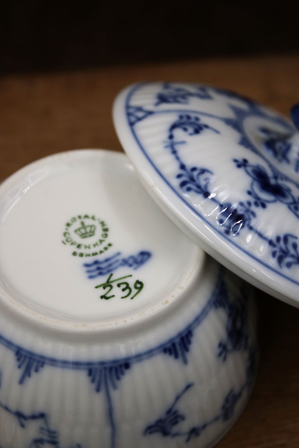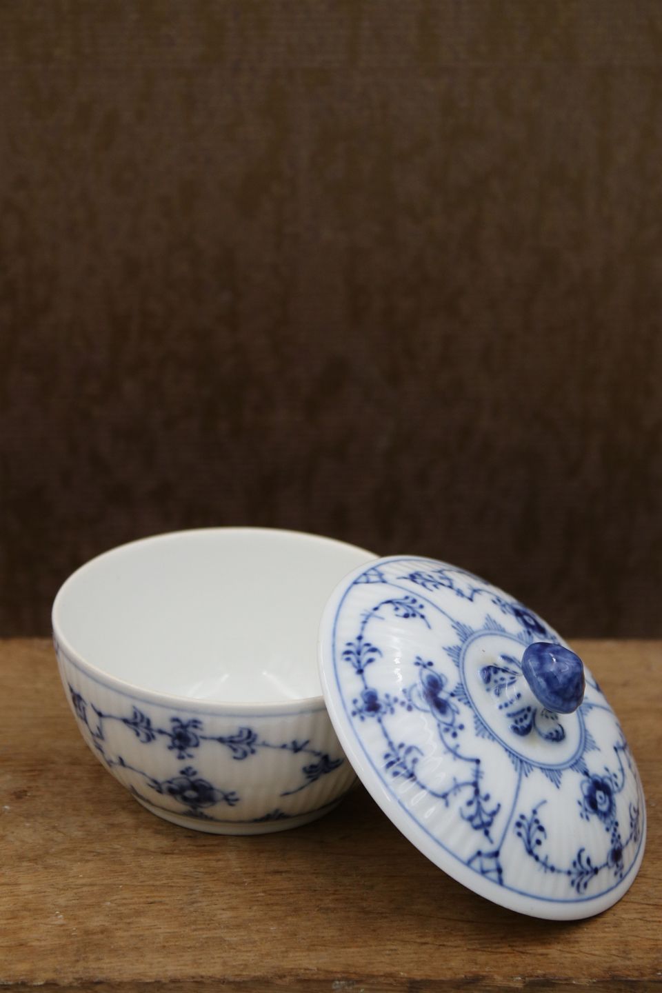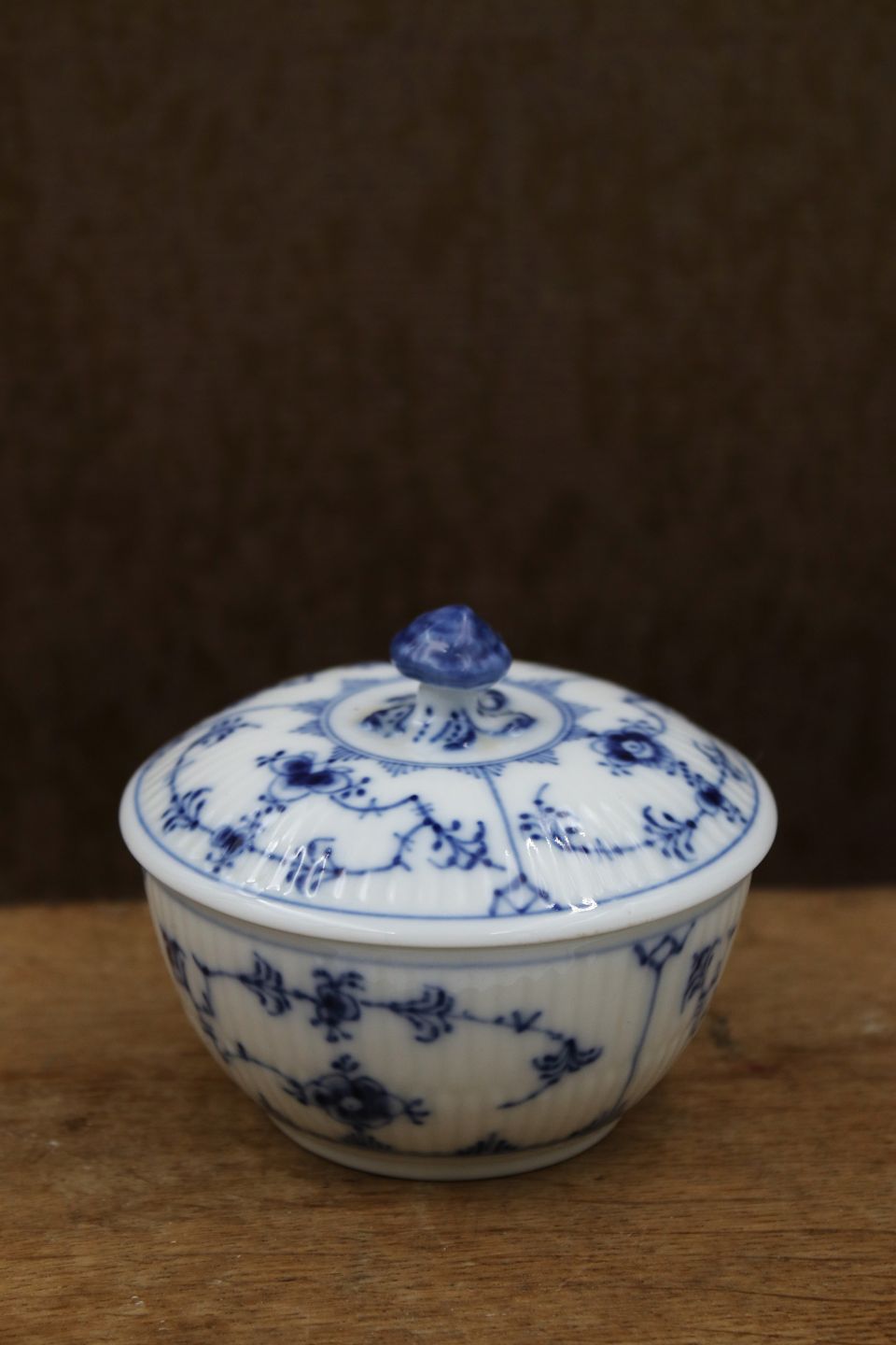 Royal Copenhagen Musselmalet Riflet sukkerskål med låg.H: 7cm. Dia.: 9cm.