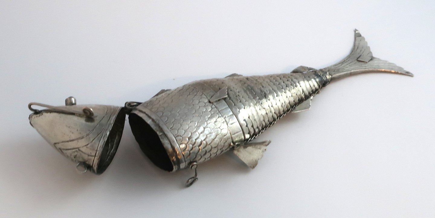 Sølv hovedvandsæg i form af stor fisk med blå sten. Længde 23,5 cm Udstiller