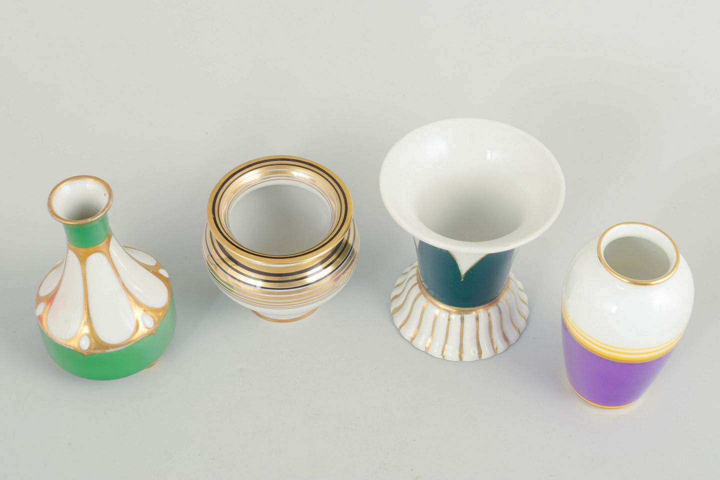 Sæt af fire tyske art deco vaser.Fire små vaser i porcelæn med klassiske art deco former og dekoration i grønne, hvide og violette nuancer med stafferinger i guld. Vaserne fremstår med elegante proportioner og karakteristisk stil fra tysk porcelænsproduktion i mellemkrigstiden.