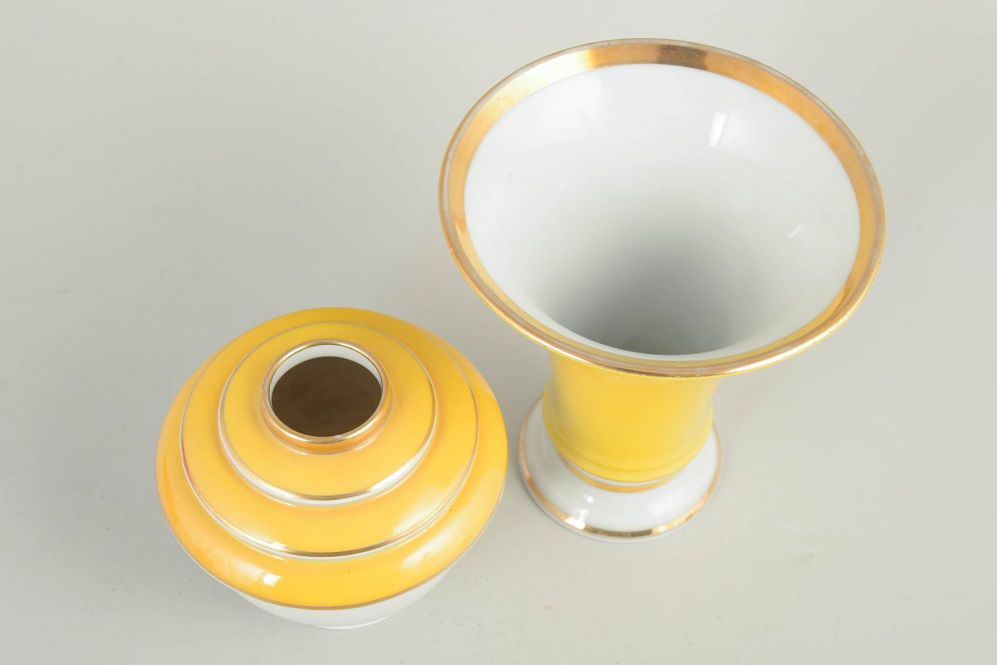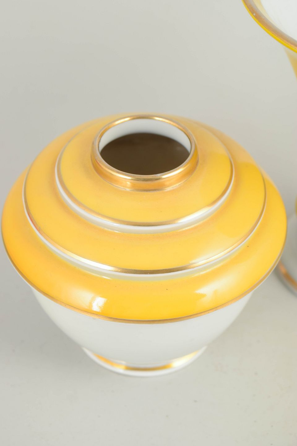 To tyske art deco vaser.To vaser i porcelæn med klassiske art deco former og dekoration i hvide og gule nuancer med stafferinger i guld. Vaserne fremstår med elegante proportioner og karakteristisk stil fra tysk porcelænsproduktion i mellemkrigstiden.
