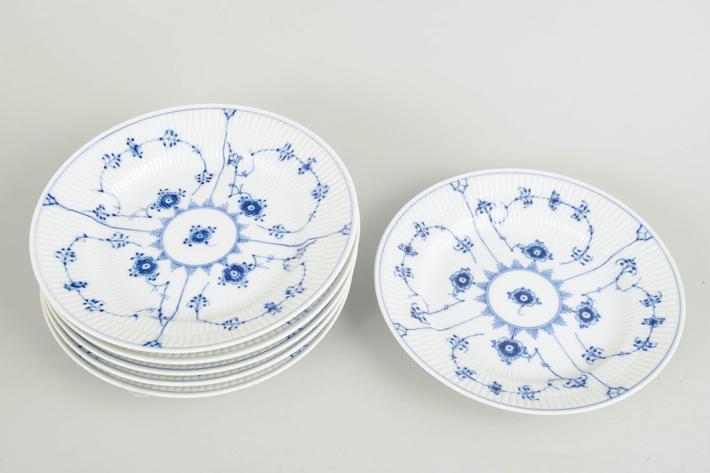 Royal Copenhagen Musselmalet Riflet sæt af seks tallerkener.Sæt af seks tallerkener i håndmalet porcelæn fra Musselmalet Riflet med klassisk underglasurdekoration i koboltblå og riflede felter.