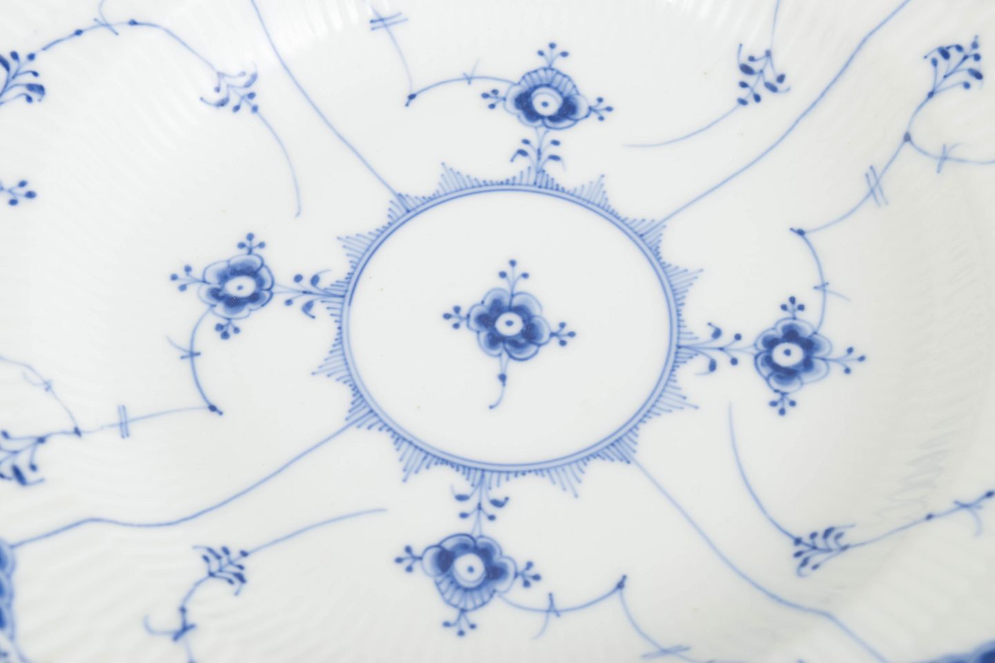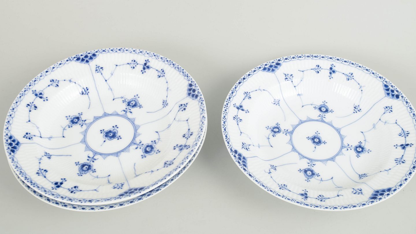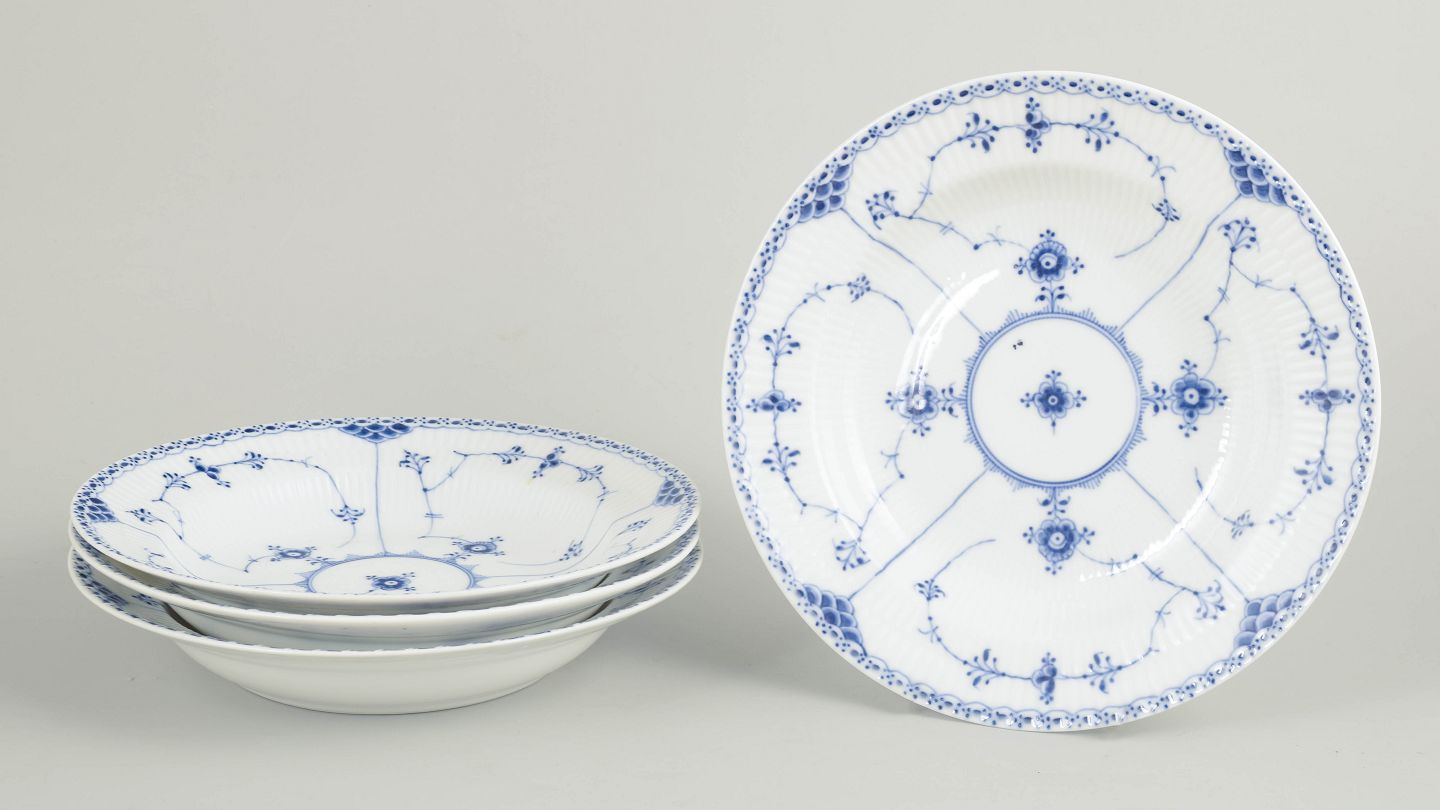 Royal Copenhagen Musselmalet Halvblonde sæt af fire dybe tallerkener.Sæt af fire dybe tallerkener i håndmalet porcelæn fra Musselmalet Halvblonde med klassisk underglasurdekoration i koboltblå og karakteristisk blondekant. Model 1/565. Første sortering.