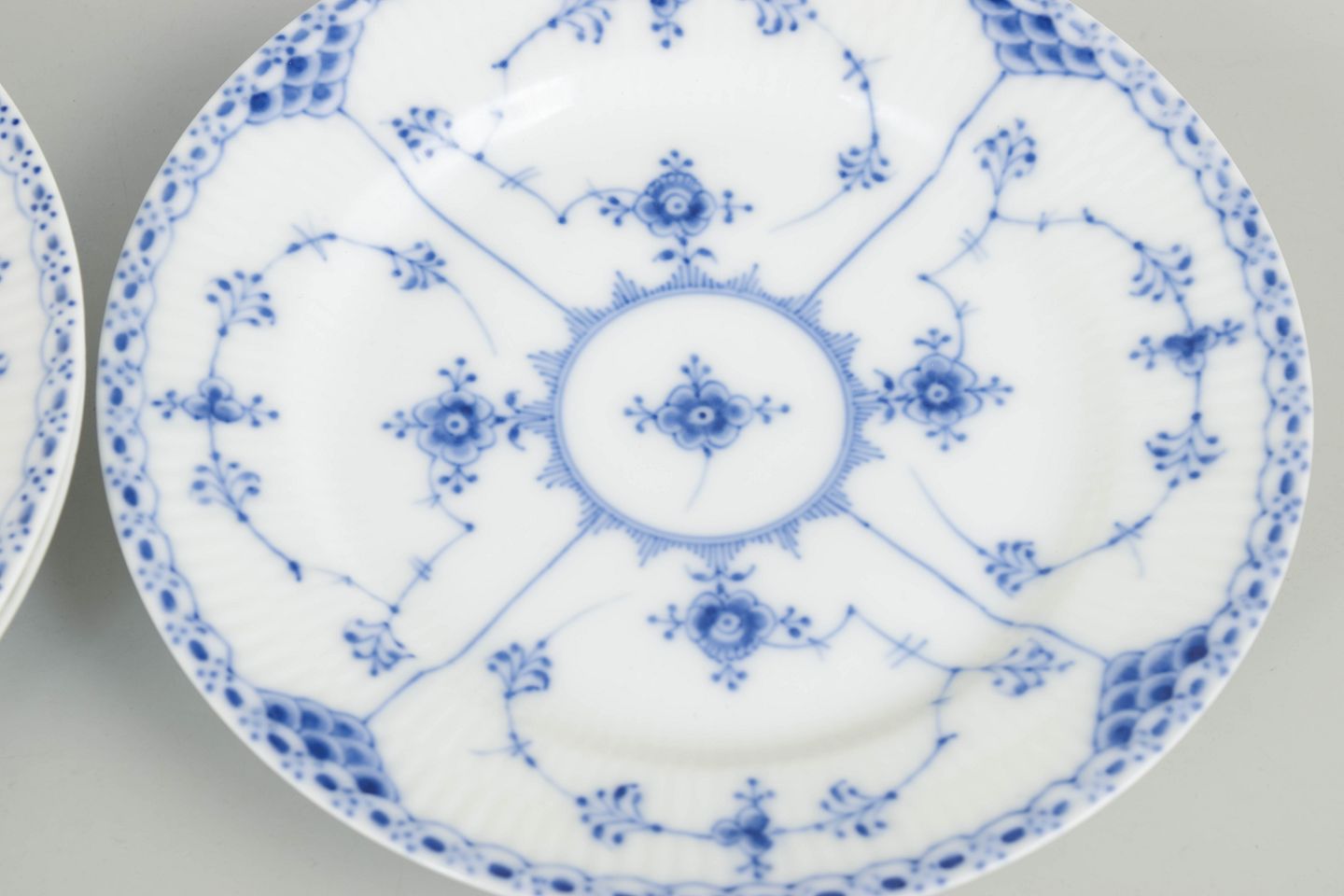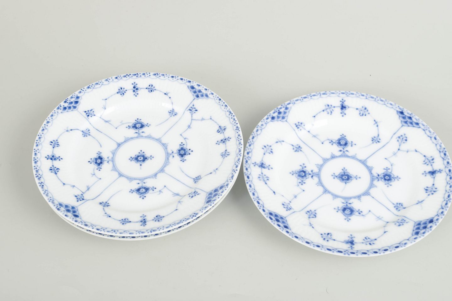 Royal Copenhagen Musselmalet Halvblonde sæt af tre tallerkener.Sæt af tre tallerkener i håndmalet porcelæn fra Musselmalet Halvblonde med klassisk underglasurdekoration i koboltblå og karakteristisk blondekant. Model 1/573. Første sortering.