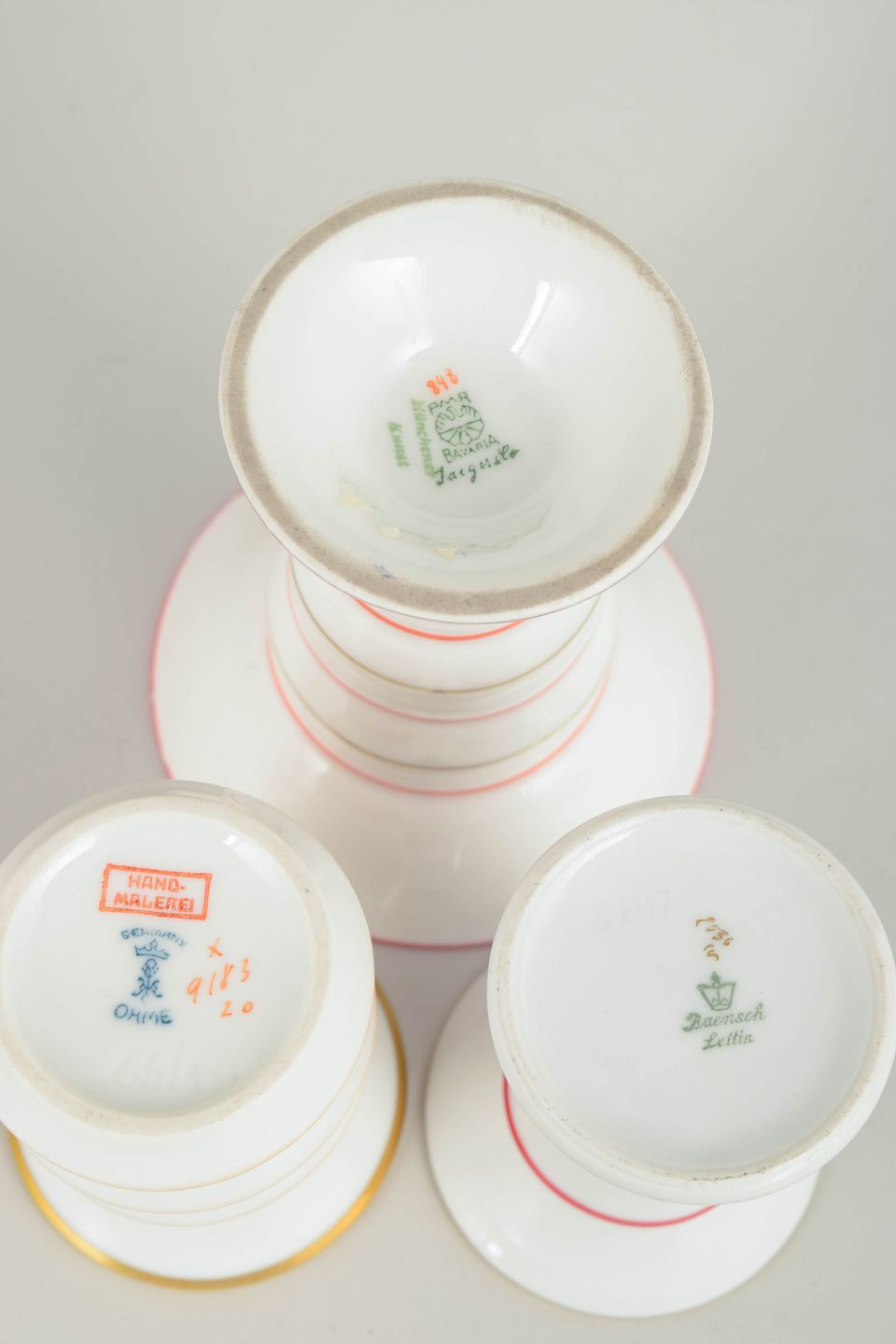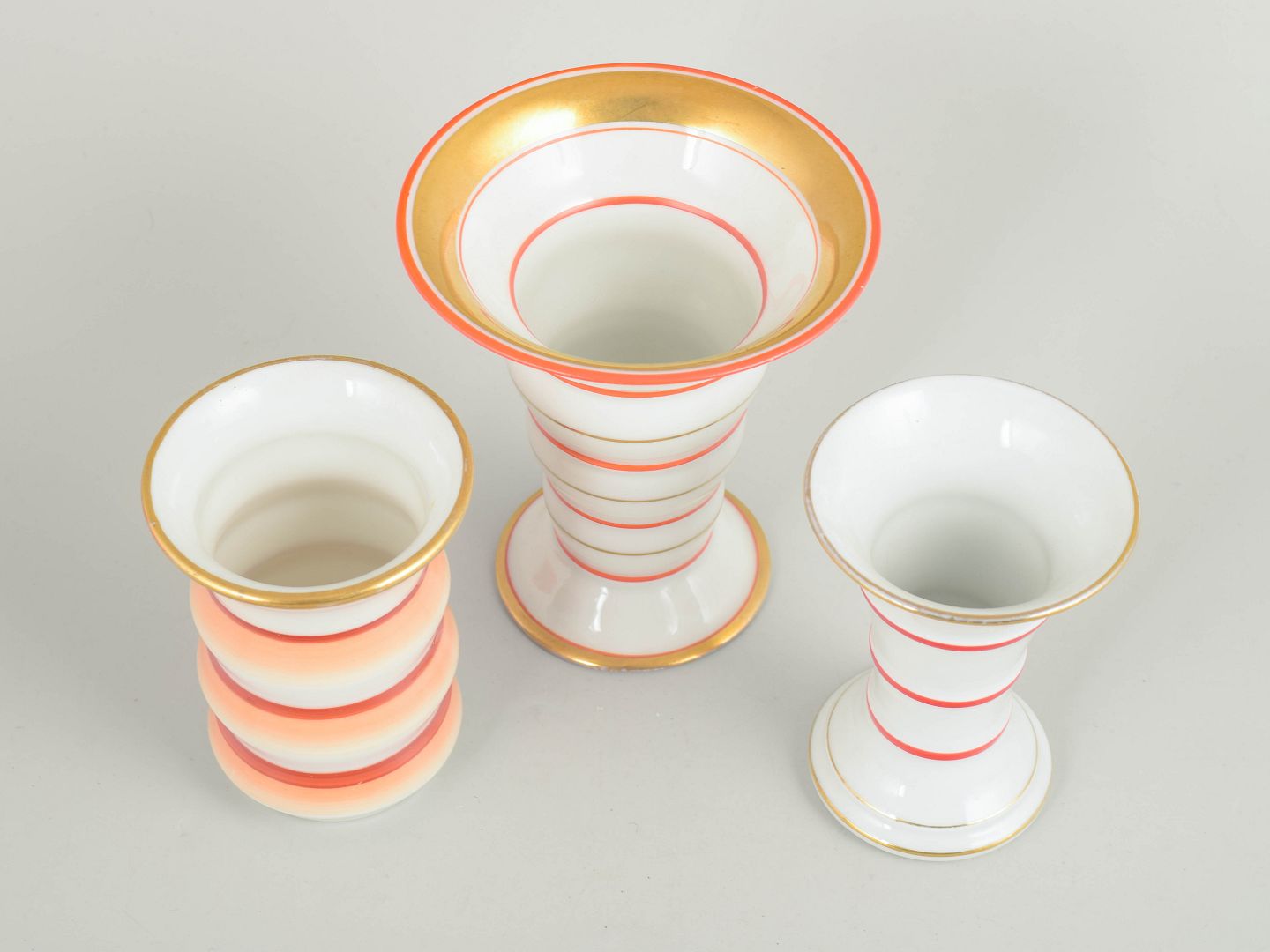 Sæt af tre tyske art deco vaser.Tre små vaser i porcelæn med klassiske art deco former og dekoration i hvide nuancer med koralrøde stafferinger og guldkant. Vaserne fremstår med elegante proportioner og karakteristisk stil fra tysk porcelænsproduktion i mellemkrigstiden.