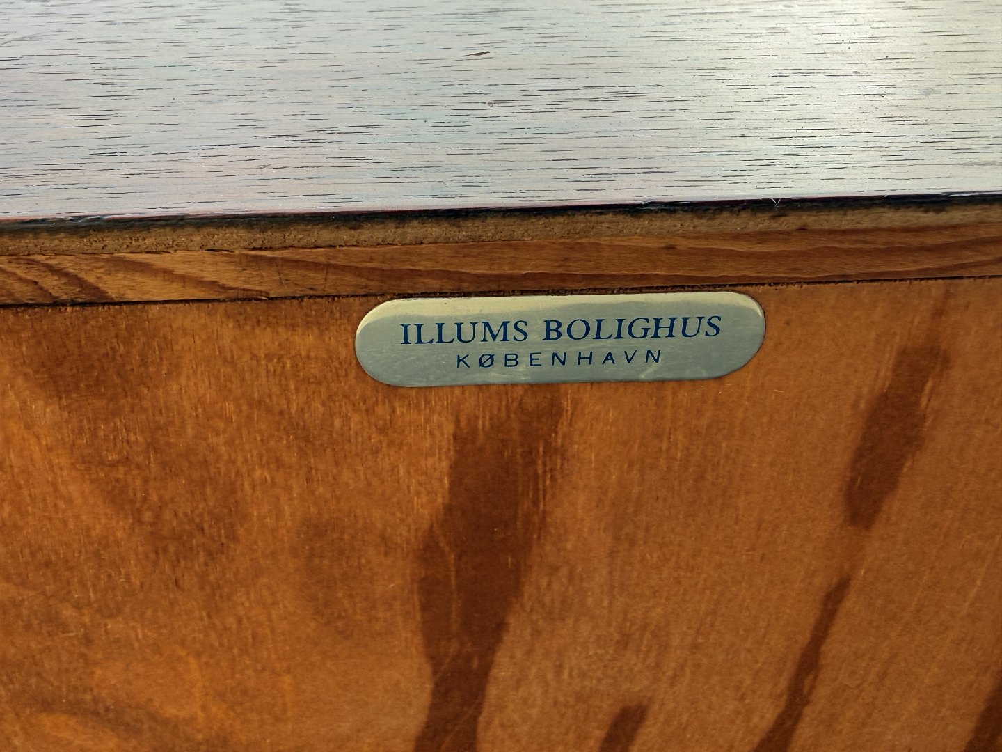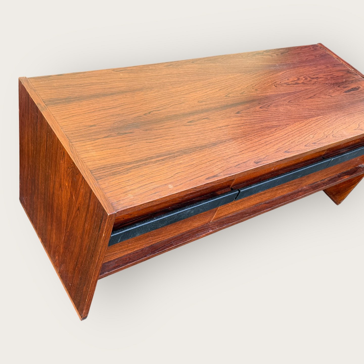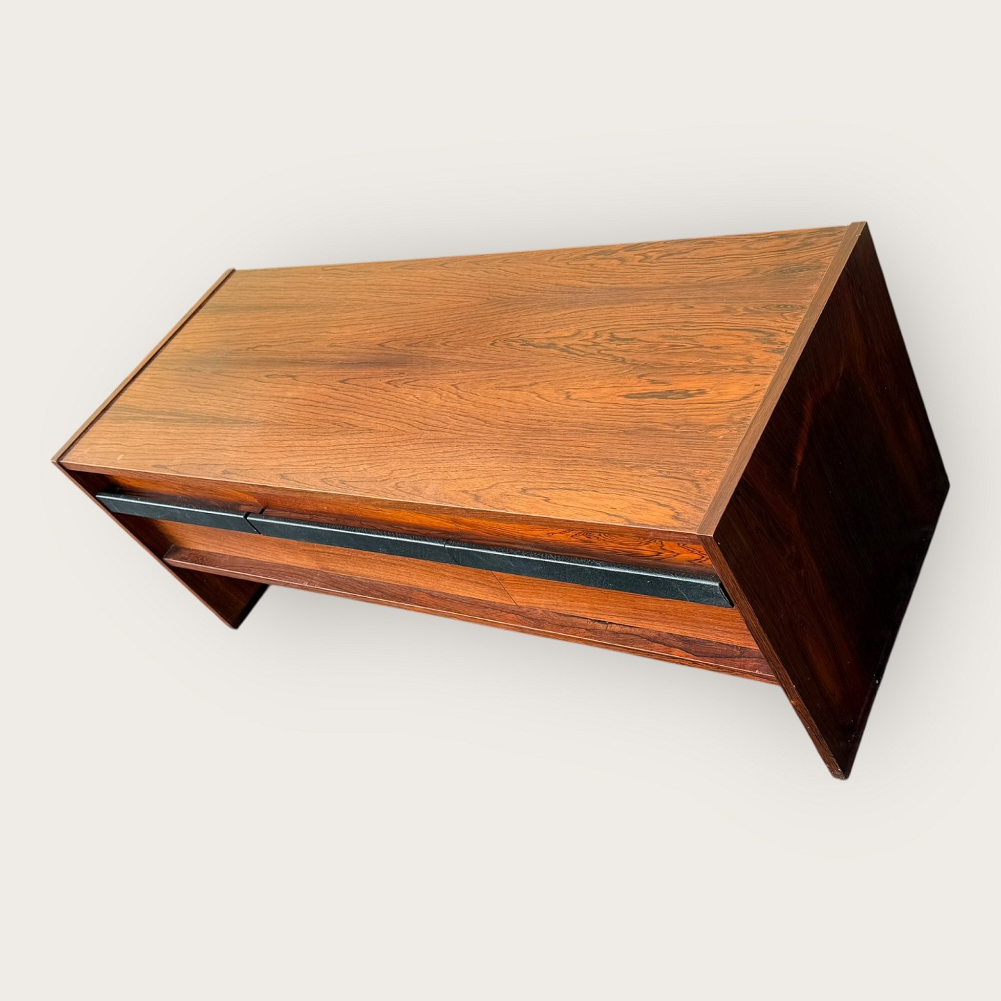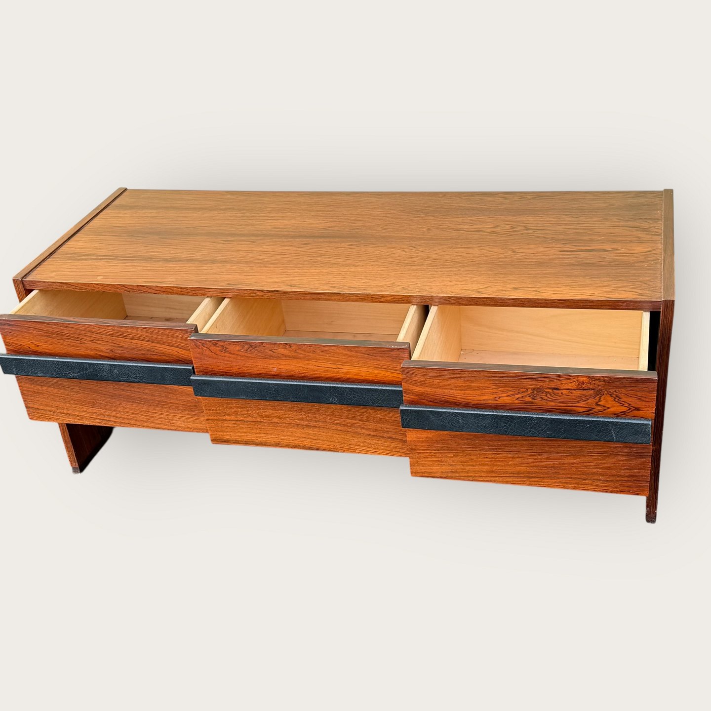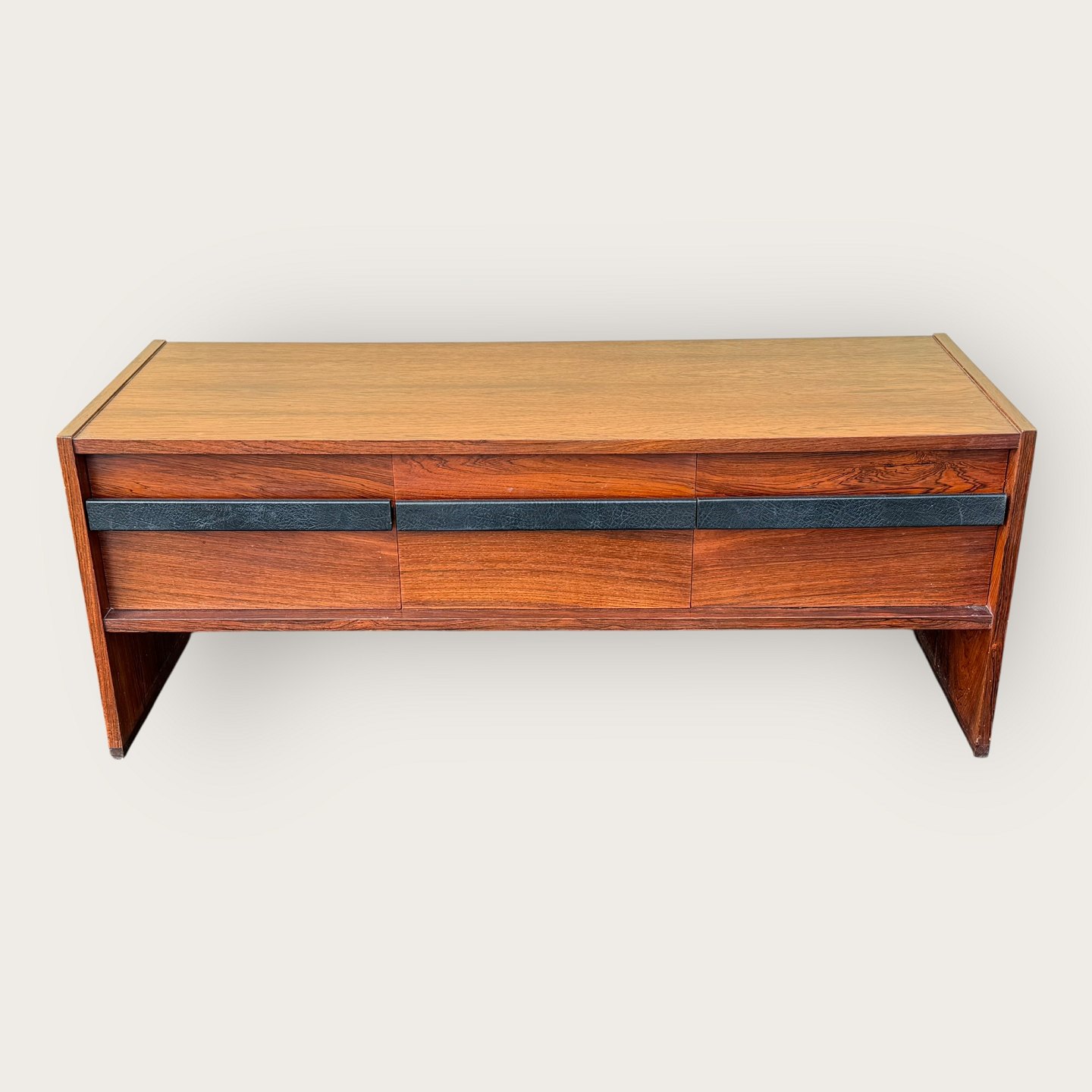 Lav skænk i palisander finer, tre skuffer med læderbetrukne håndtag, Udgået og mærket fra Illums Bolighus, Mål: HxBxD 46x116x45cm, har været stort entresæt i kombination med Palisanderspejlet varnr. 632831 *Fremstår i pæn brugt stand med få brugsspor*Lager: 1
