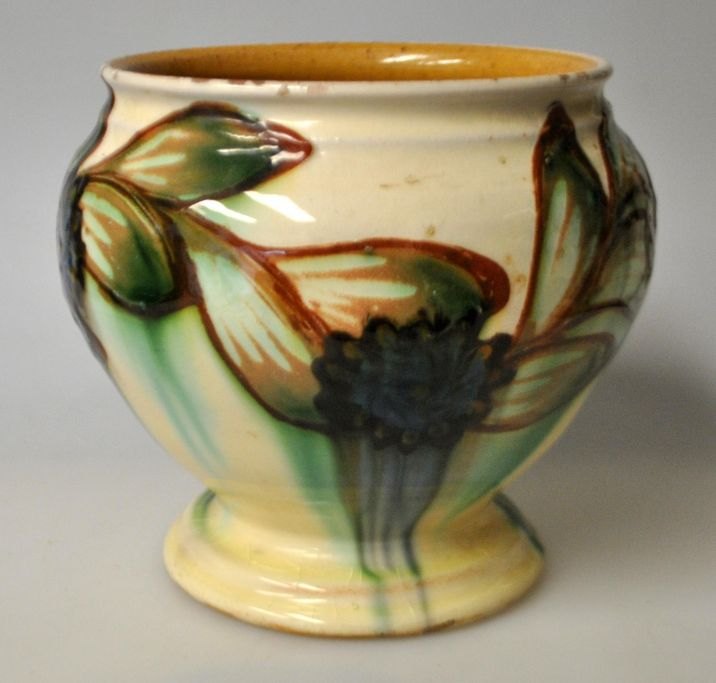 H. A. Kähler urtepotte, 20. årh. Næstved, Danmark. Glaseret. Med grønne, brune, blå og sorte glasurer. Stemplet. 13 cm.NB: Med små kanthak!