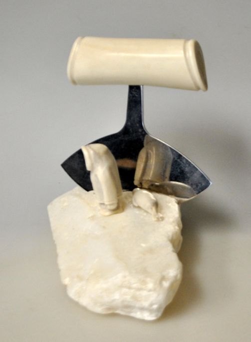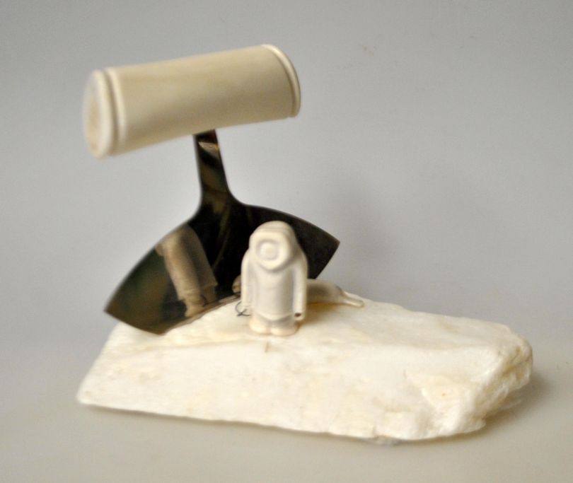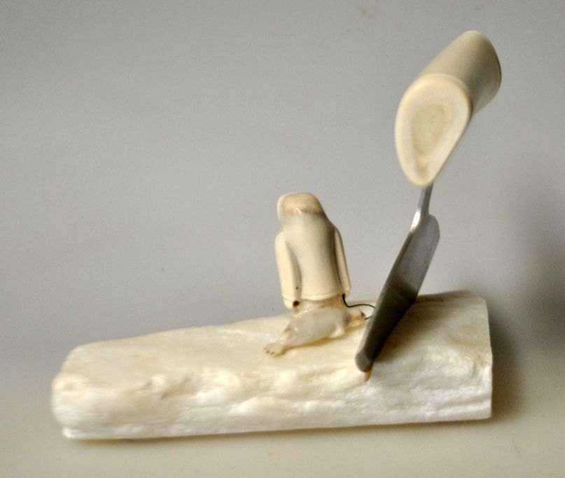 Grønlandsk figur, 2012. Figur og ulu i rensdyr knogle. På hvid fedtsten base. Signeret: Ilulissat. L.: 14 cm. B.: 8 cm. H. 10 cm.Emne nummer: 28967