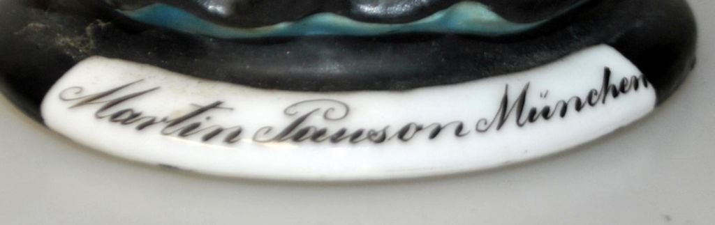 Martin Pauson (1861 - 1934) Tyskland: Ølkrus med "Münchner Kindl", der er en munk.  Håndbemalet bisquit porcelæn. Krus med hank og gæk af tin, i form af Frauenkirke. I bunden lithophane med bymotiv. Signeret: Martin Pauson, München. Højde.: 22 cm.