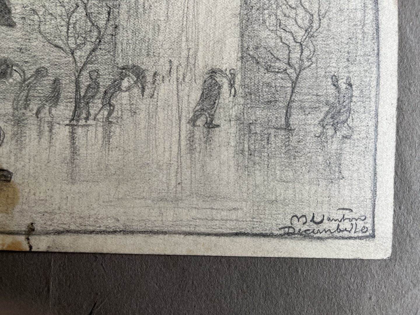 Tegning af Mogens Vantore - Mand med trækvogn i regnvejr 1920.