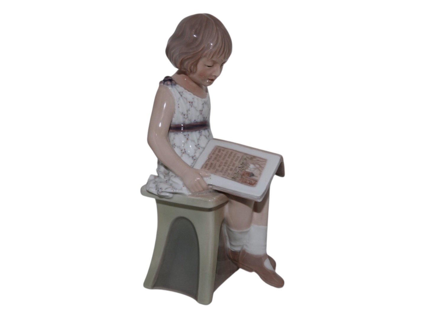 Stor Dahl Jensen figur, pige med bog siddende på lysegrøn stol.Af fabriksmærket ses det, at denne er produceret mellem 1928 og 1985.