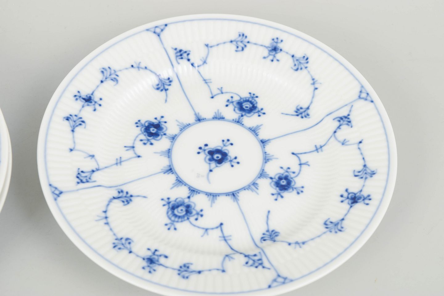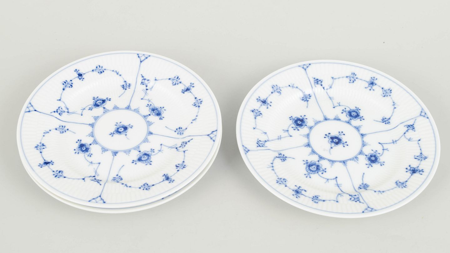 Royal Copenhagen Musselmalet Riflet, sæt af tre kagetallerkener.Sæt af tre kagetallerkener i håndmalet porcelæn fra Musselmalet Riflet med klassisk underglasurdekoration i koboltblå. Model 1/180. Første sortering. Tallerkenerne måler D. 17 cm. Fremstillet i 1970’erne.