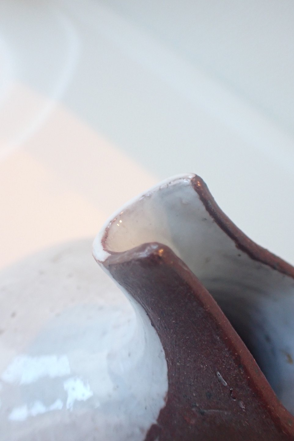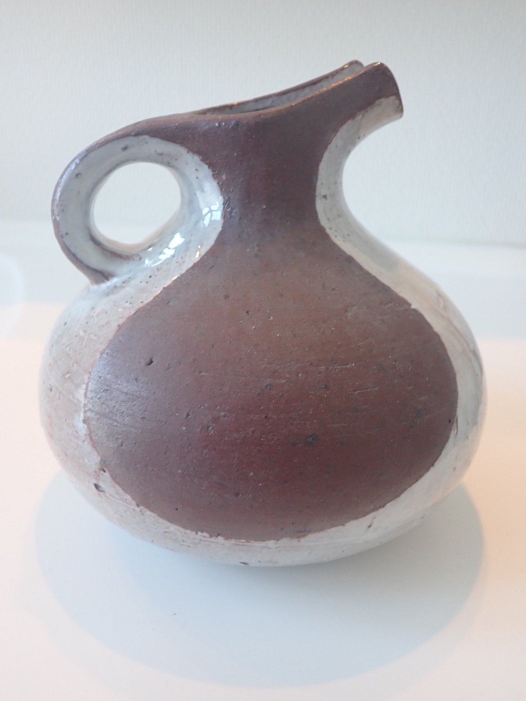 Gutte Eriksen (1918 - 2008) - spaltekande i hårdtbrændt ler med delvis, skulpturel glasering i lysegrå nuance. Ca. 1950. Højde: 14 cm. Bredeste bredde: 13,5 cm. I fin stand. Udstiller