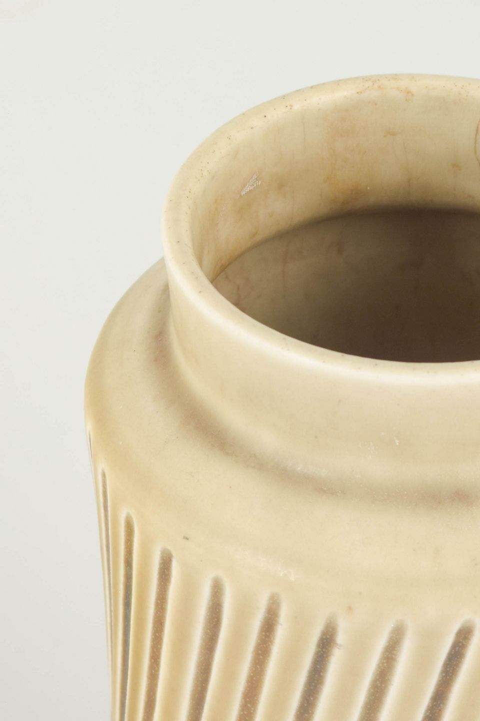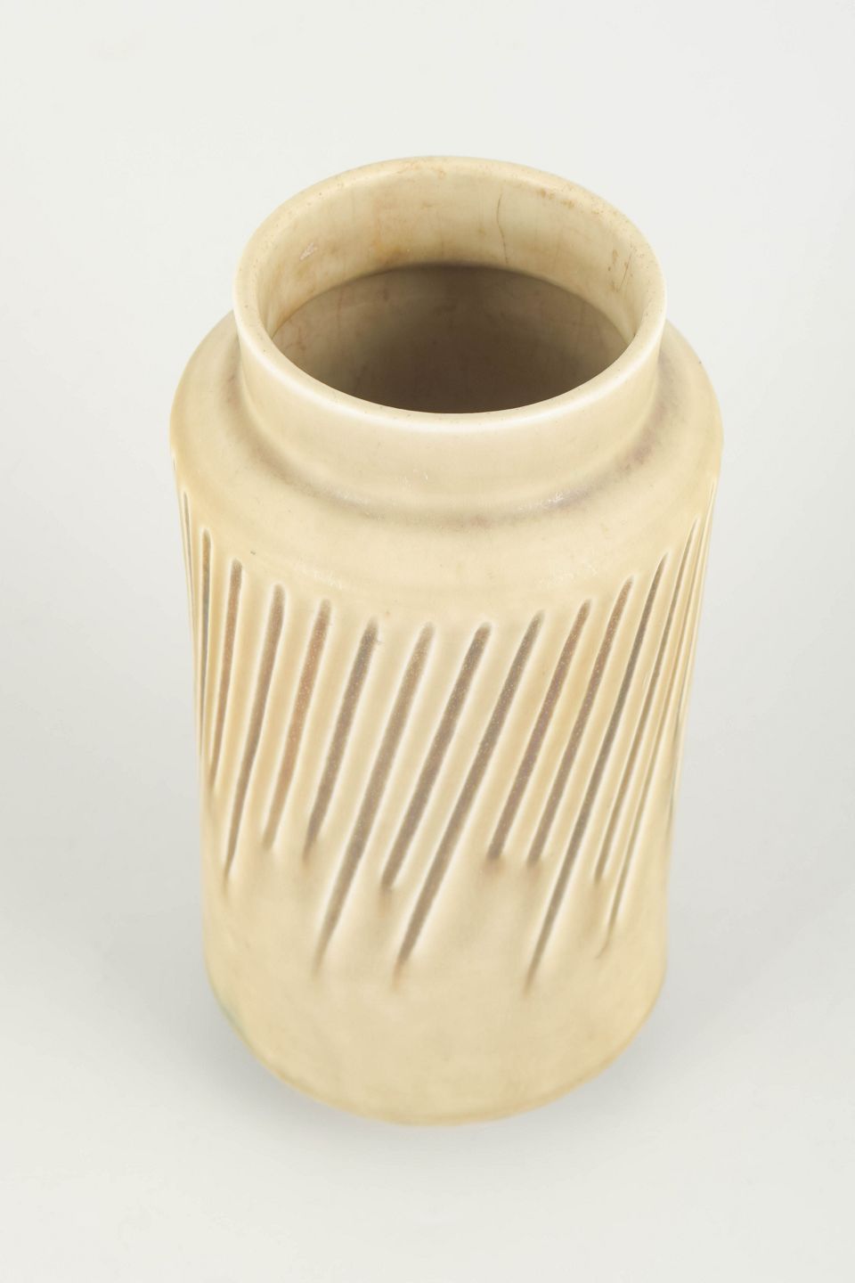 Eva Stæhr-Nielsen for Saxbo, vase.Cylinderformet vase i stentøj med lodrette, diagonalt skårne reliefspor og ensartet, lys beige glasur. Stram og modernistisk form med markant struktureret overflade.