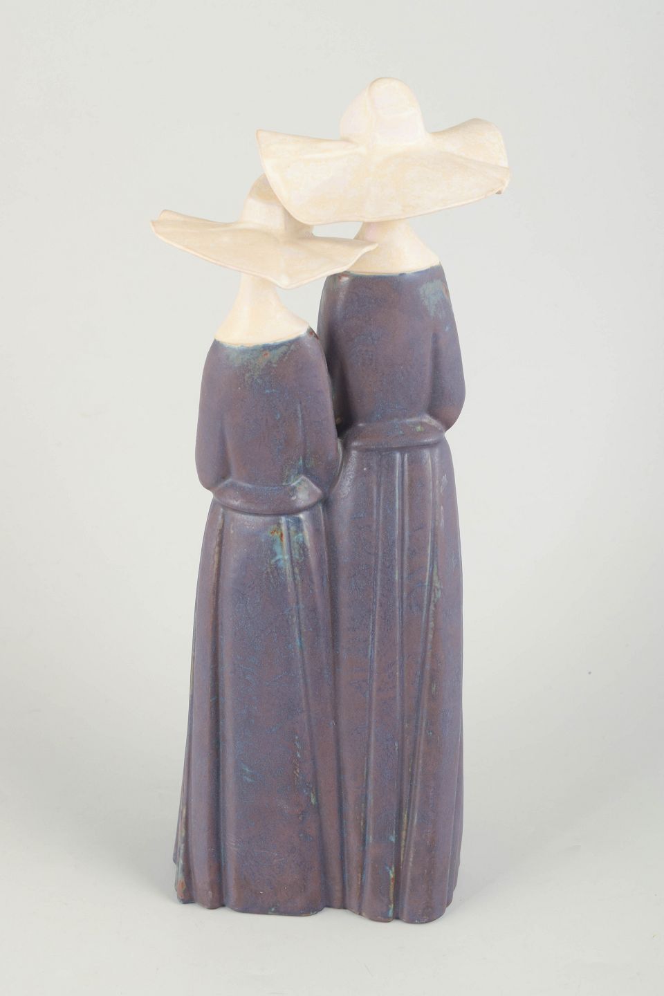 Lladró stor figurgruppe i porcelæn.Monumental keramisk figurgruppe fra 1980’erne, fremstillet i porcelæn med karakteristisk blød modellering og afdæmpet glasur i violette og cremefarvede toner. Figuren forestiller to stiliserede kvindeskikkelser med brede hatte og elegante, vertikale kjolelinjer. Undersiden mærket Lladró, Hand Made in Spain, Daisa.