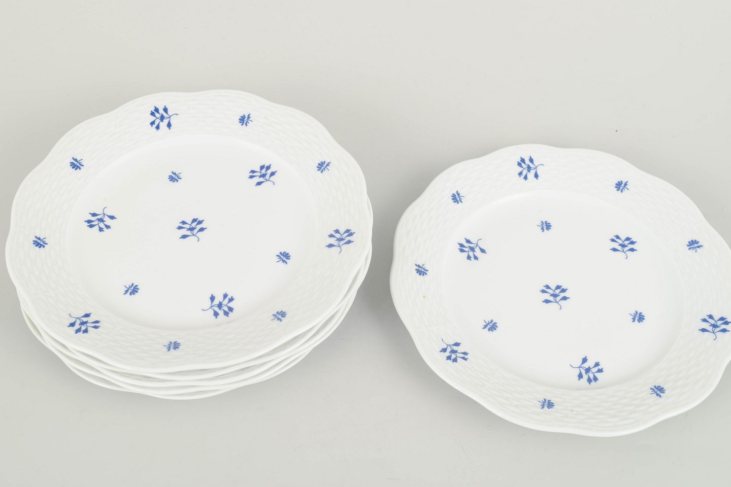 Herend, sæt af seks tallerkener.Elegant sæt af seks håndmalede porcelænstallerkener fra Herend med diskret blå blomstermotiv fordelt over fanen og midterfeltet. Den let bølgede rand og fine reliefstruktur giver en klassisk og raffineret fremtoning, karakteristisk for fabrikkens mellemkrigsproduktion. Et harmonisk og dekorativt stel i mindre format.