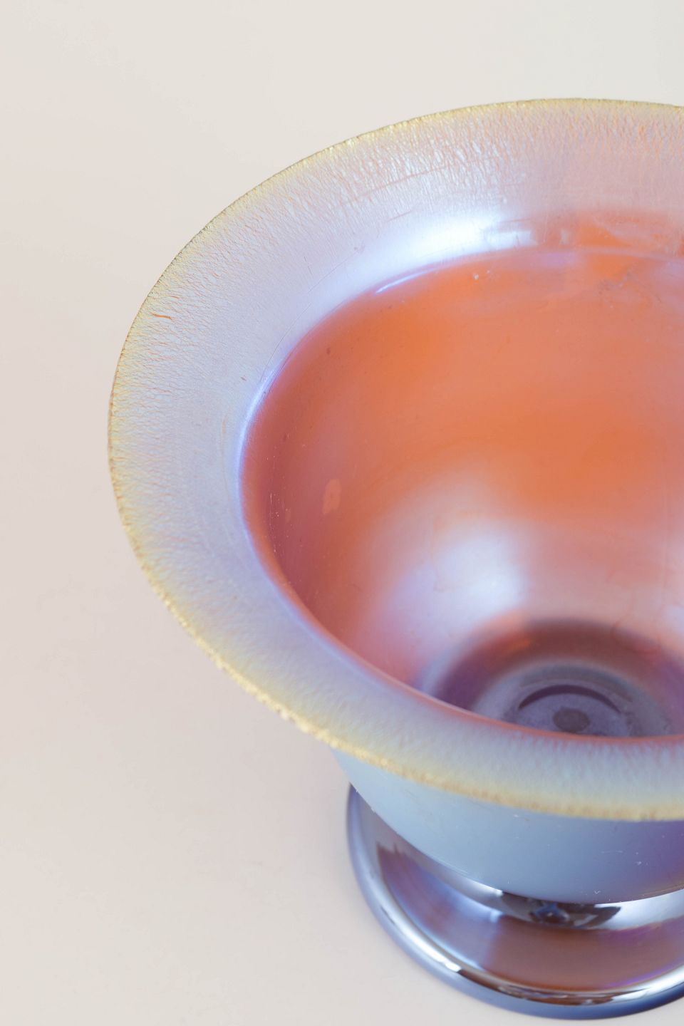 Loetz iridescent glass vase.Bowl-shaped vase in mouth-blown glass with a wide, slightly flaring rim and short foot. The surface features a silky matte iridescent finish in blue and violet tones with a warm coppery glow inside. The simple, classical form combined with the vibrant colour play is characteristic of Loetz production in the 1920s, when harmonious proportions and metallic sheen were key aesthetic elements.
