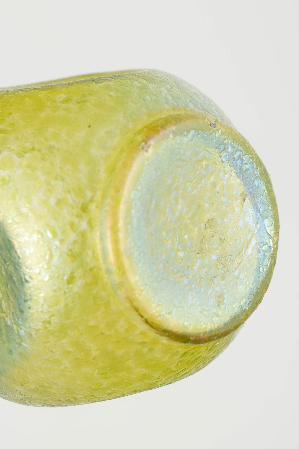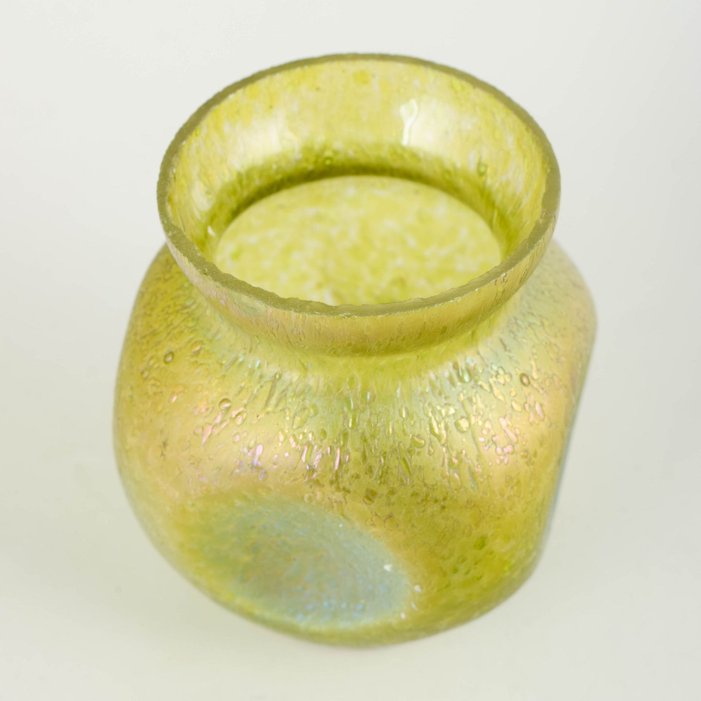 Loetz iriserende glasvase.Kompakt vase i mundblæst glas med kraftig iriserende overflade i gulgrønne og blålige nuancer. Den rundede korpus med let udadbøjet hals og subtile, organiske strukturer i glasset er karakteristisk for Loetz’ mellemkrigsproduktion, hvor levende farvespil og metallisk glans var centrale virkemidler.