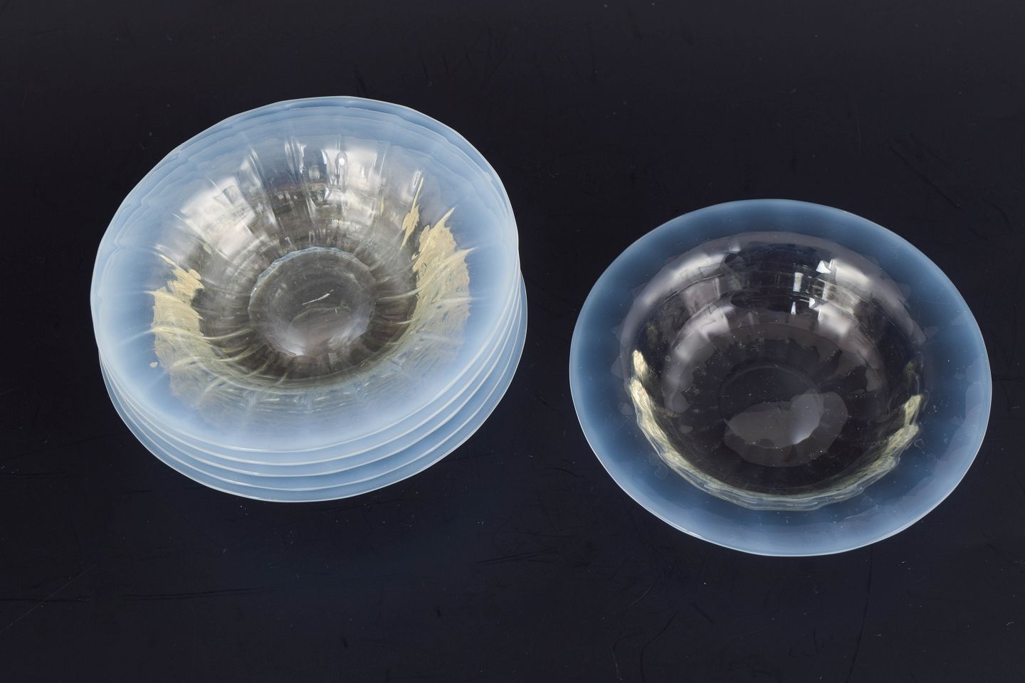 Sæt med seks små kunstglasskåle.Seks små kunstglasskåle udført i europæisk studioglas med klar, let rillet form og blødt buet profil. Skålene har en harmonisk, organisk silhuet og fremstår med elegant gennemsigtighed.