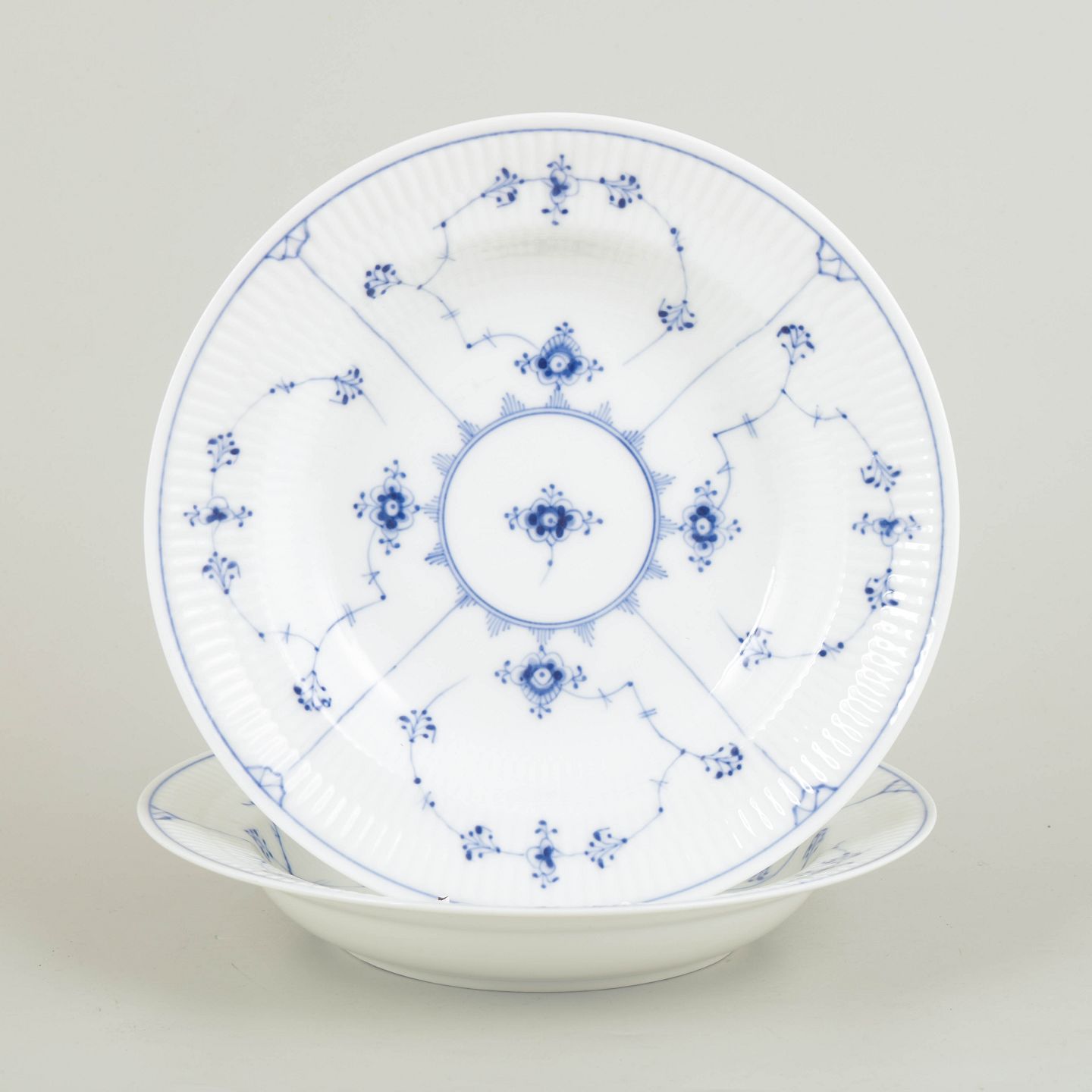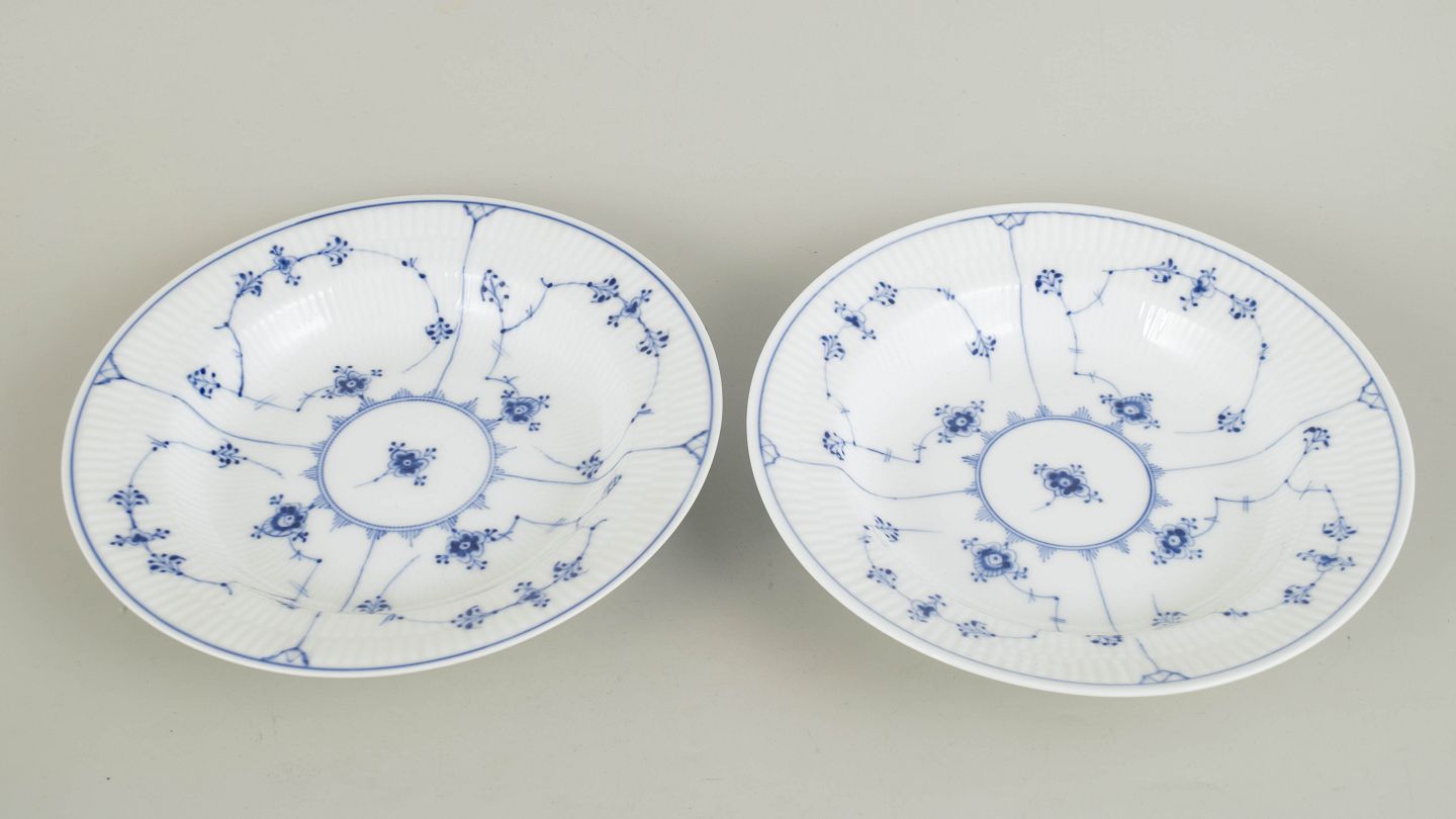 Royal Copenhagen Musselmalet Riflet to dybe suppetallerkener.To håndmalede dybe suppetallerkener i Musselmalet Riflet dekoration, model 1/165, fra 1920’erne. Første sortering.