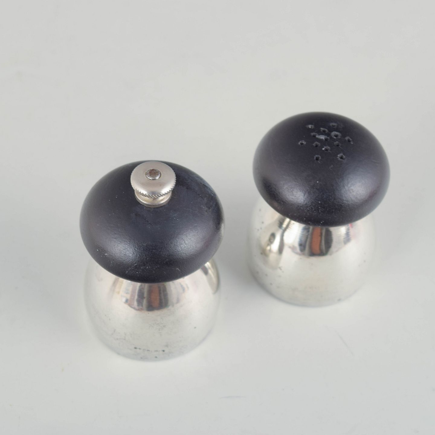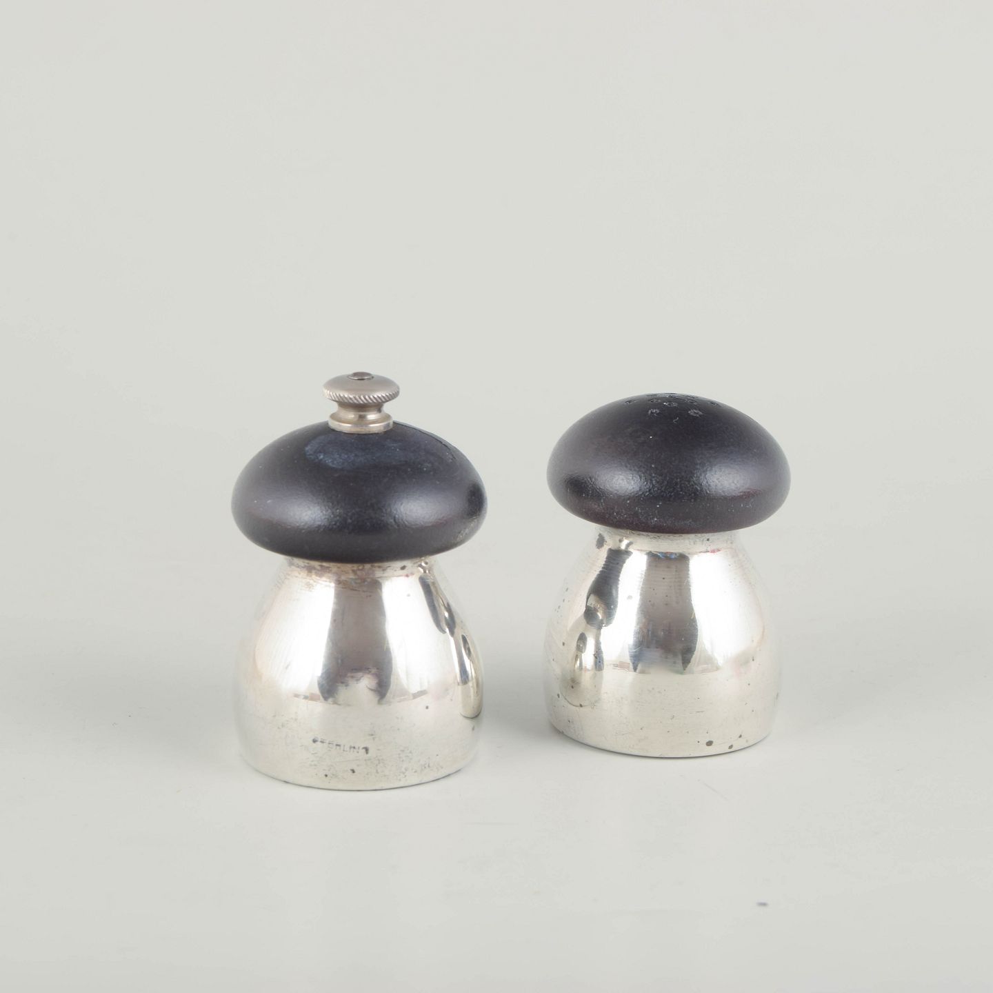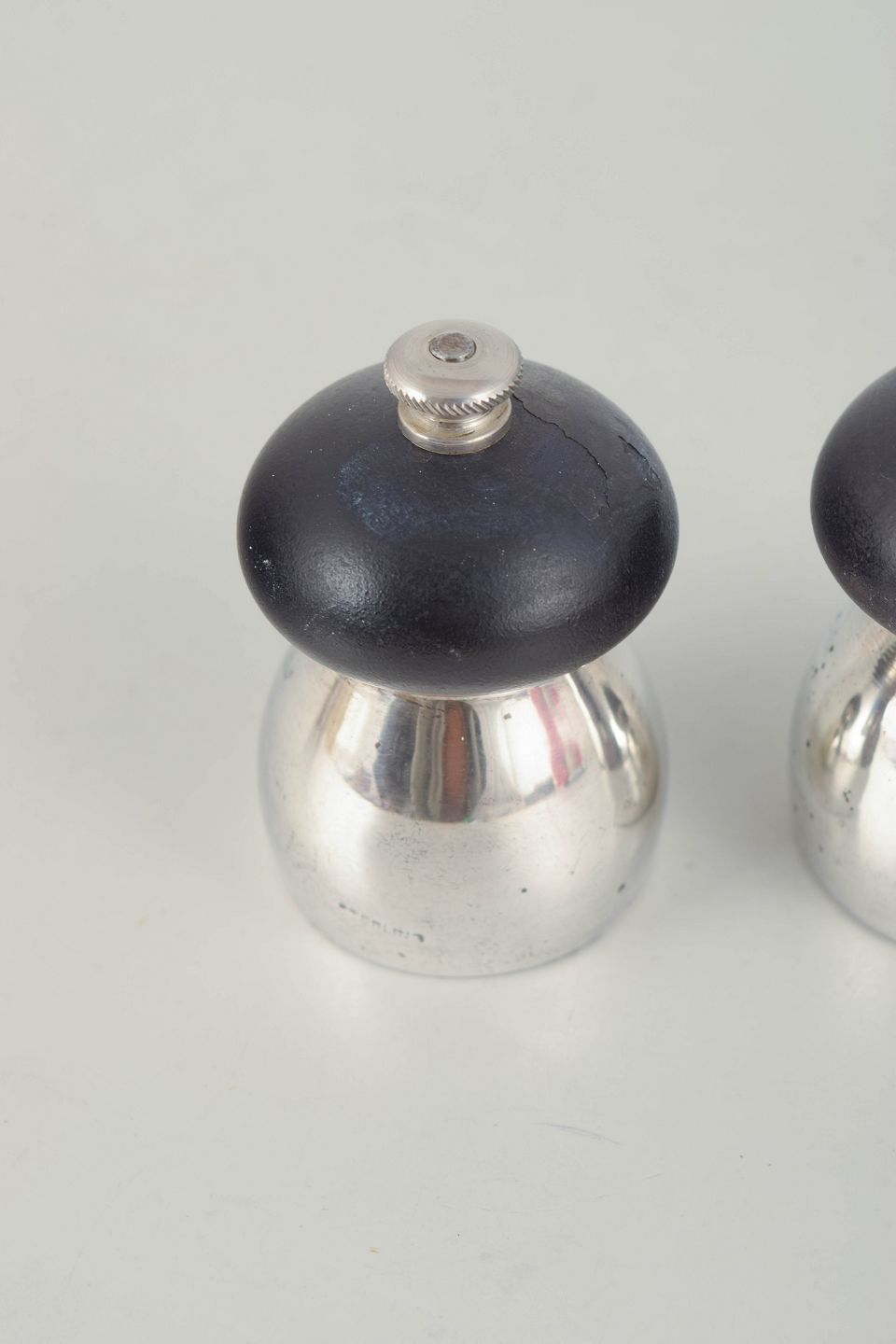Tre Spade, Italien, sæt af to modernistiske salt- og peberbøsser i sterlingsølv.Par kompakte og elegant formgivne salt- og peberbøsser udført i sterlingsølv med mørke knopgreb. Fremstår med bløde, afrundede former typiske for italiensk design fra midten af det 20. århundrede.