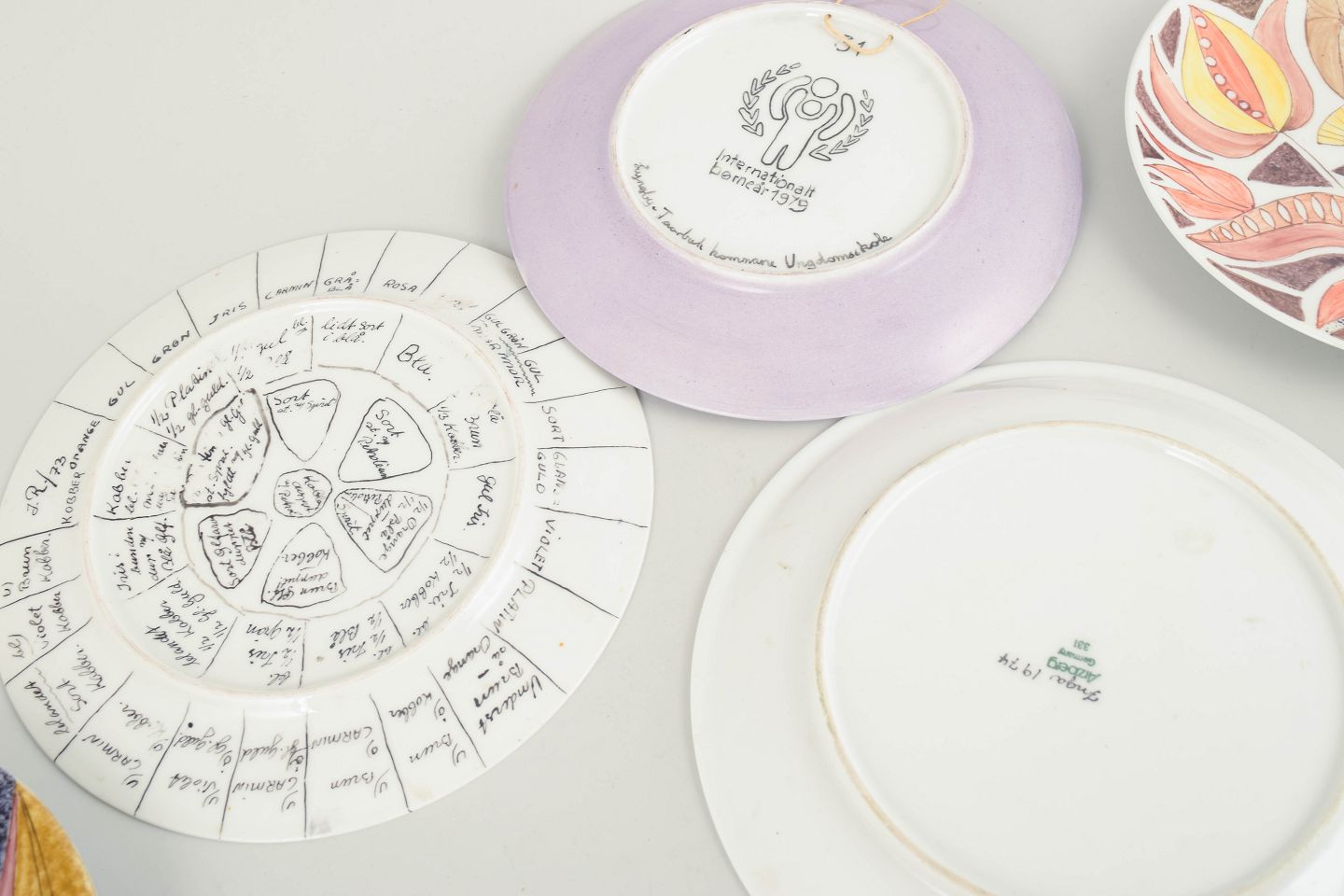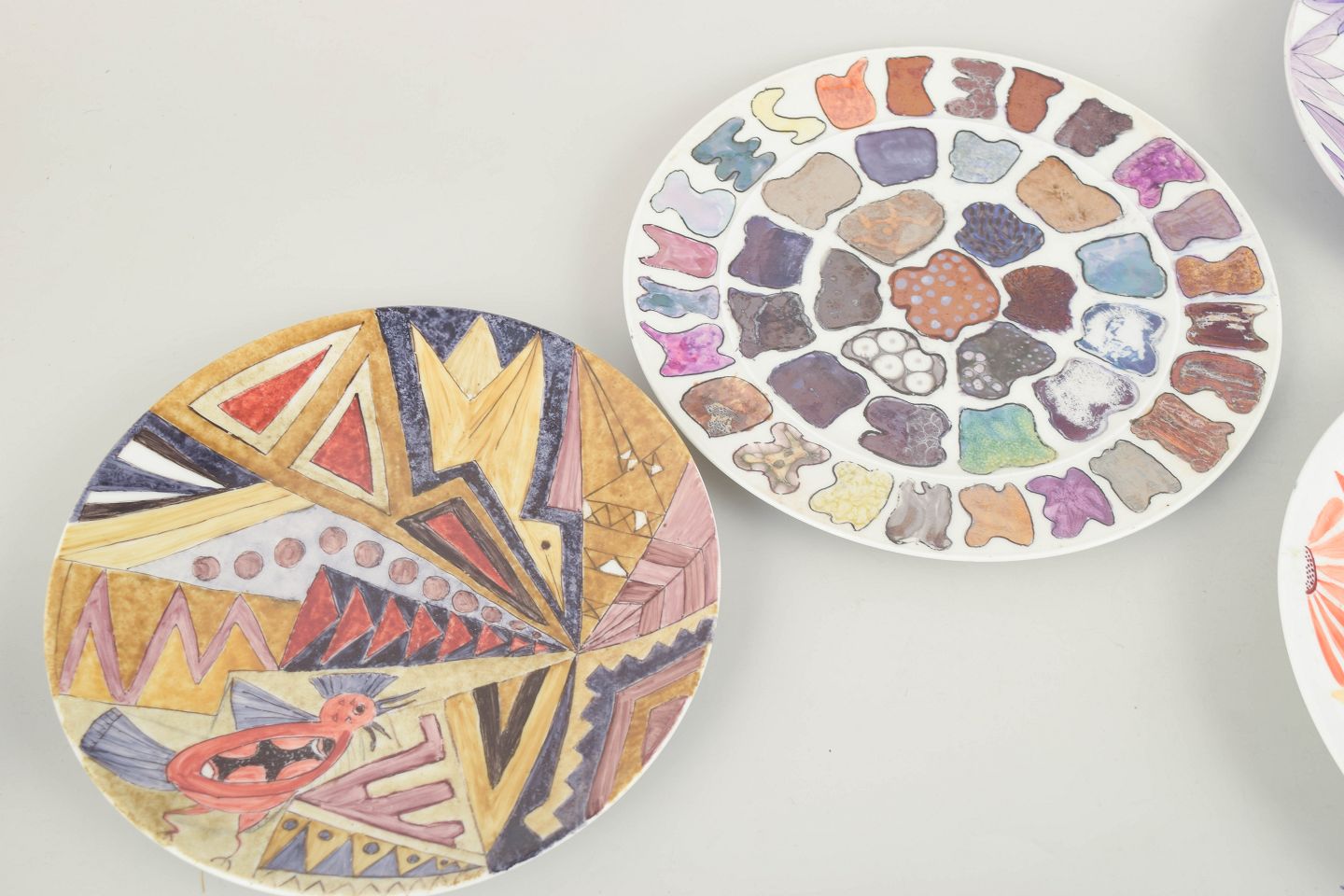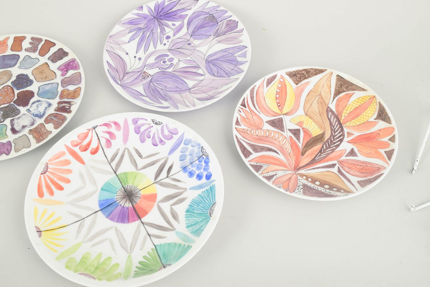 Sæt af fem håndmalede porcelænstallerkener.Dekorative tallerkener i håndmalet porcelæn med individuelle mønstre i organiske og geometriske former i varme og violette farvetoner.