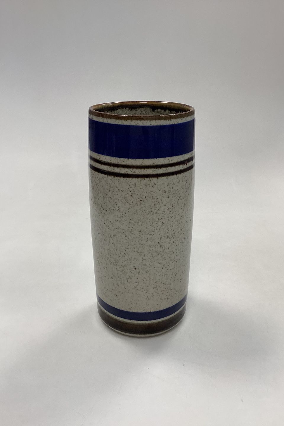 Michael Andersen Keramik Stentøjsvase. Beigemeleret med brune og mørkeblå striber.Måler 22,5 cm x 9,5 cm / 8,86 in. x 3,74 in.