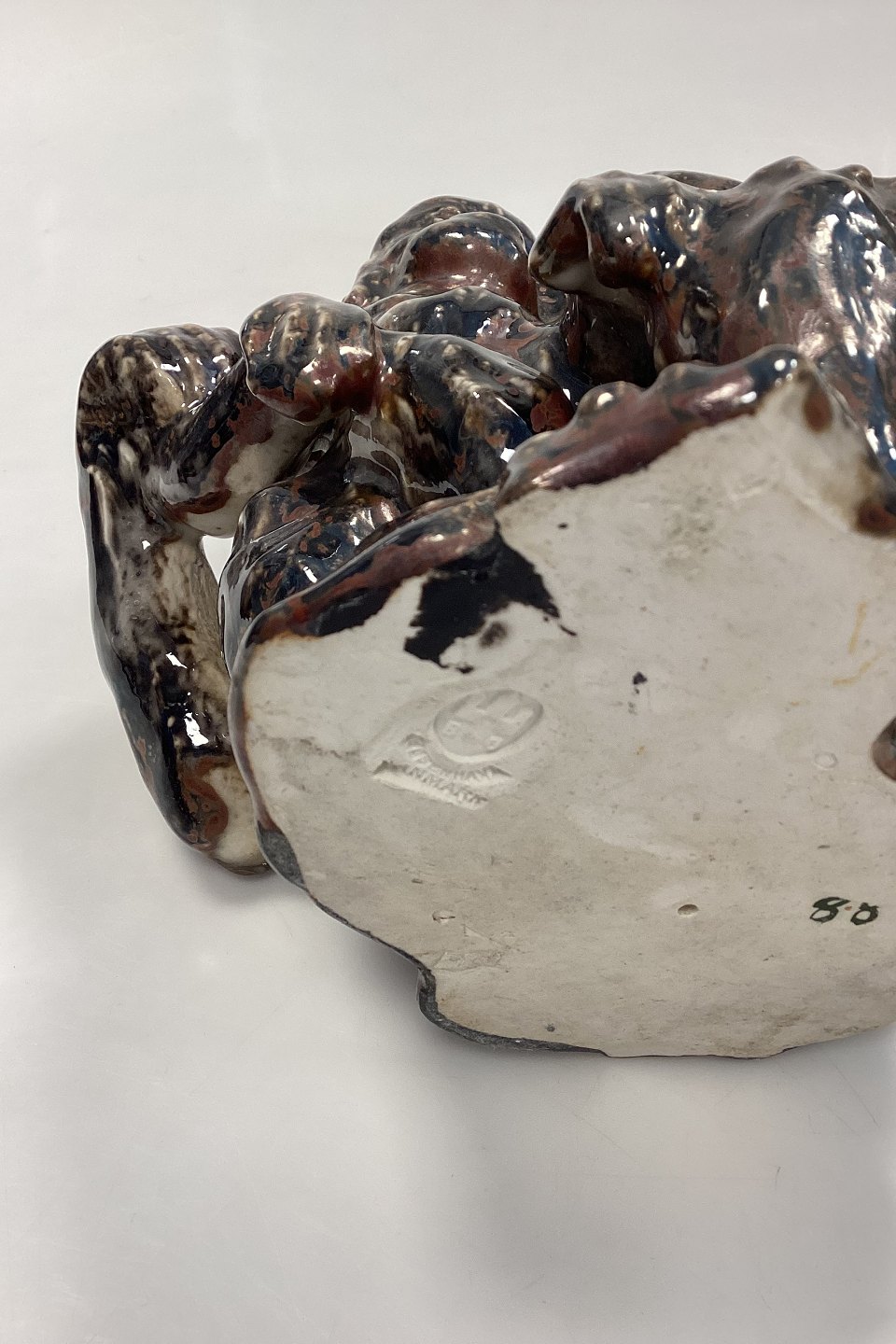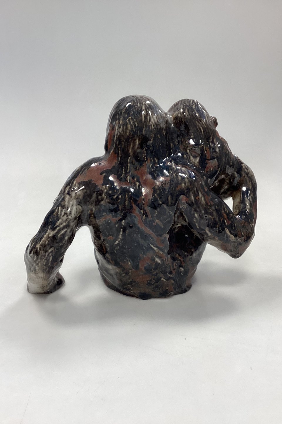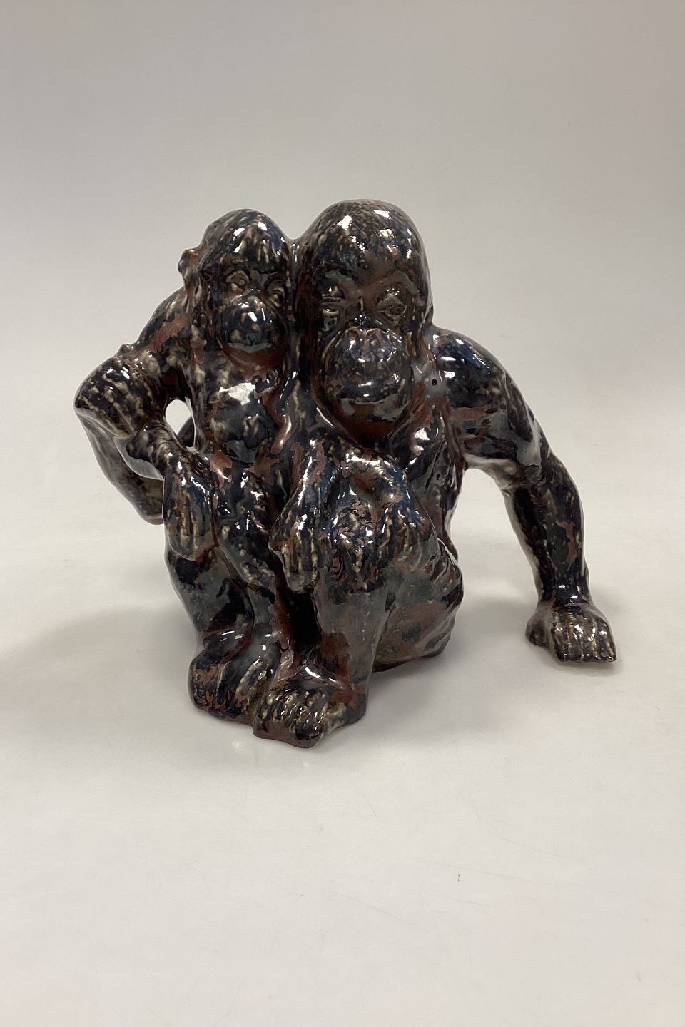 Bing og Grøndahl Stentøjsfigur - Orangutang/Abe med Unge af Knud Kyhn. Glasur i brun, blodrød og hvid. Der er 2 glasurhuller på abemors venstre side. Bunden er mærket med tallet 88.Måler 25 cm x 21 cm / 7,28 in. x 8,27 in.