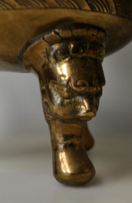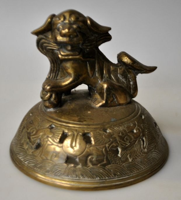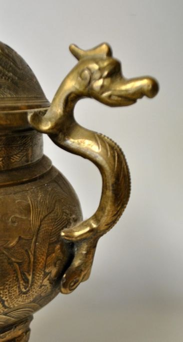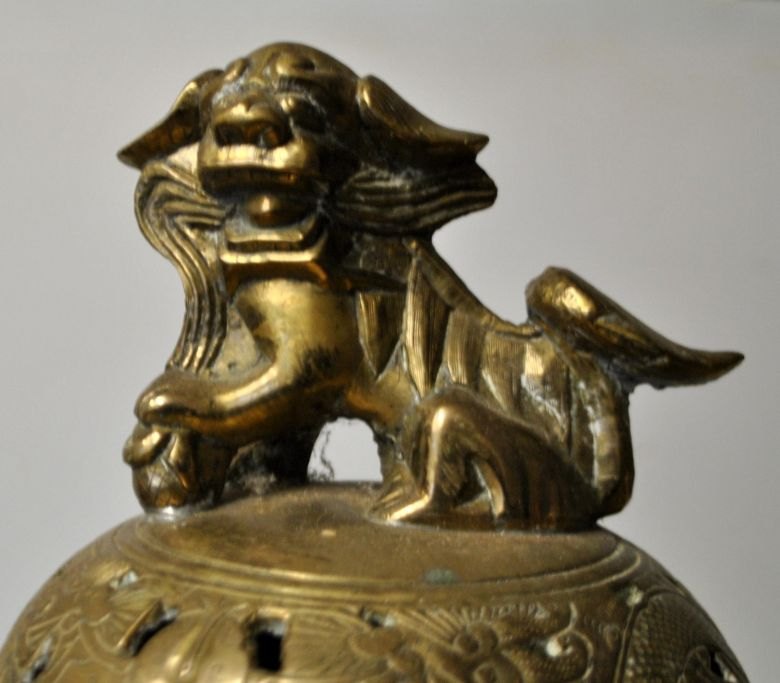 Kinesisk røgelseskrukke i bronze på tre ben, 19. årh. Med to ører; gennembrudt låg med dekoration i form af løve. På korpus dekoreret med drage og blomster. H.: 32 cm. B.: 25 cm. Stemplet.Emne nummer: 29042