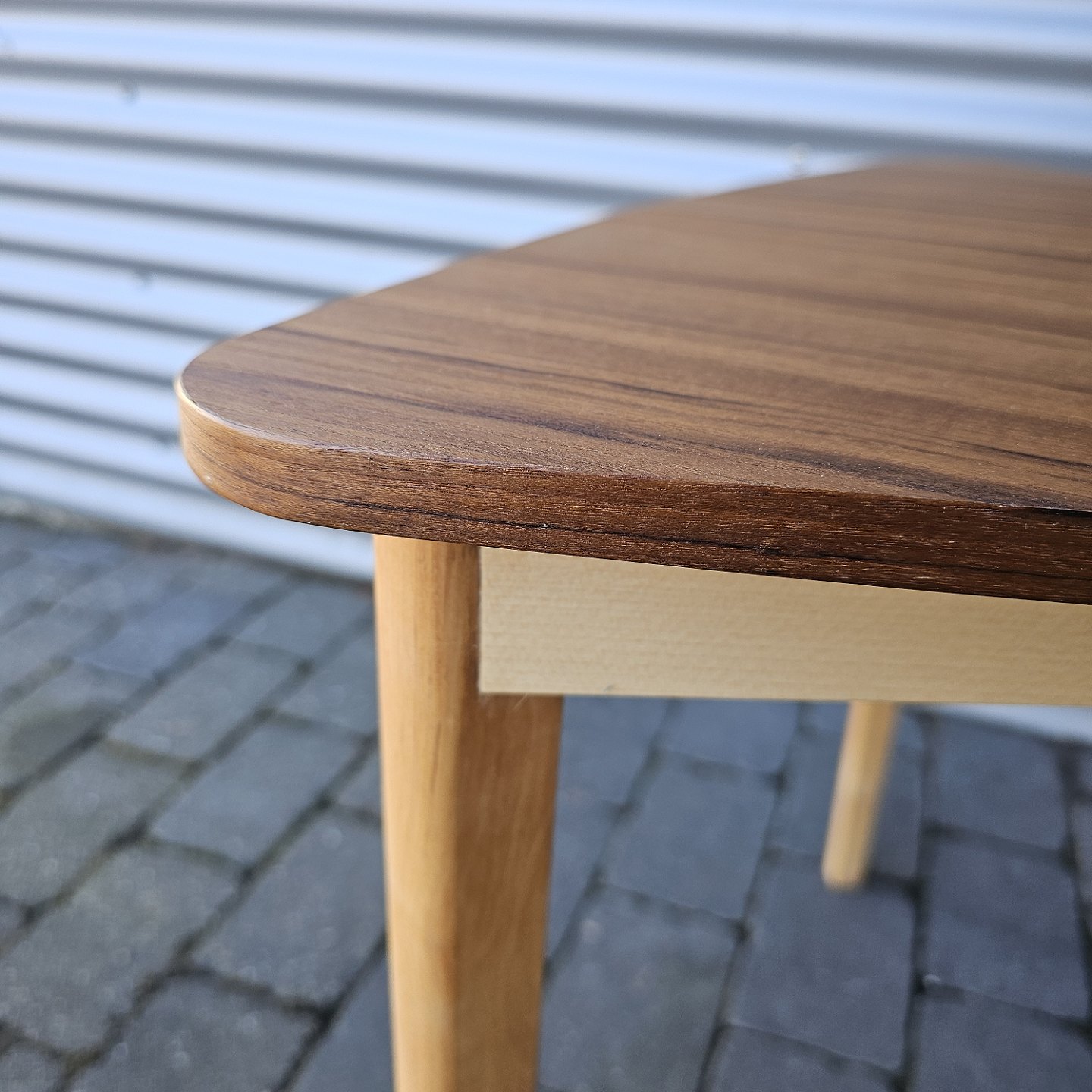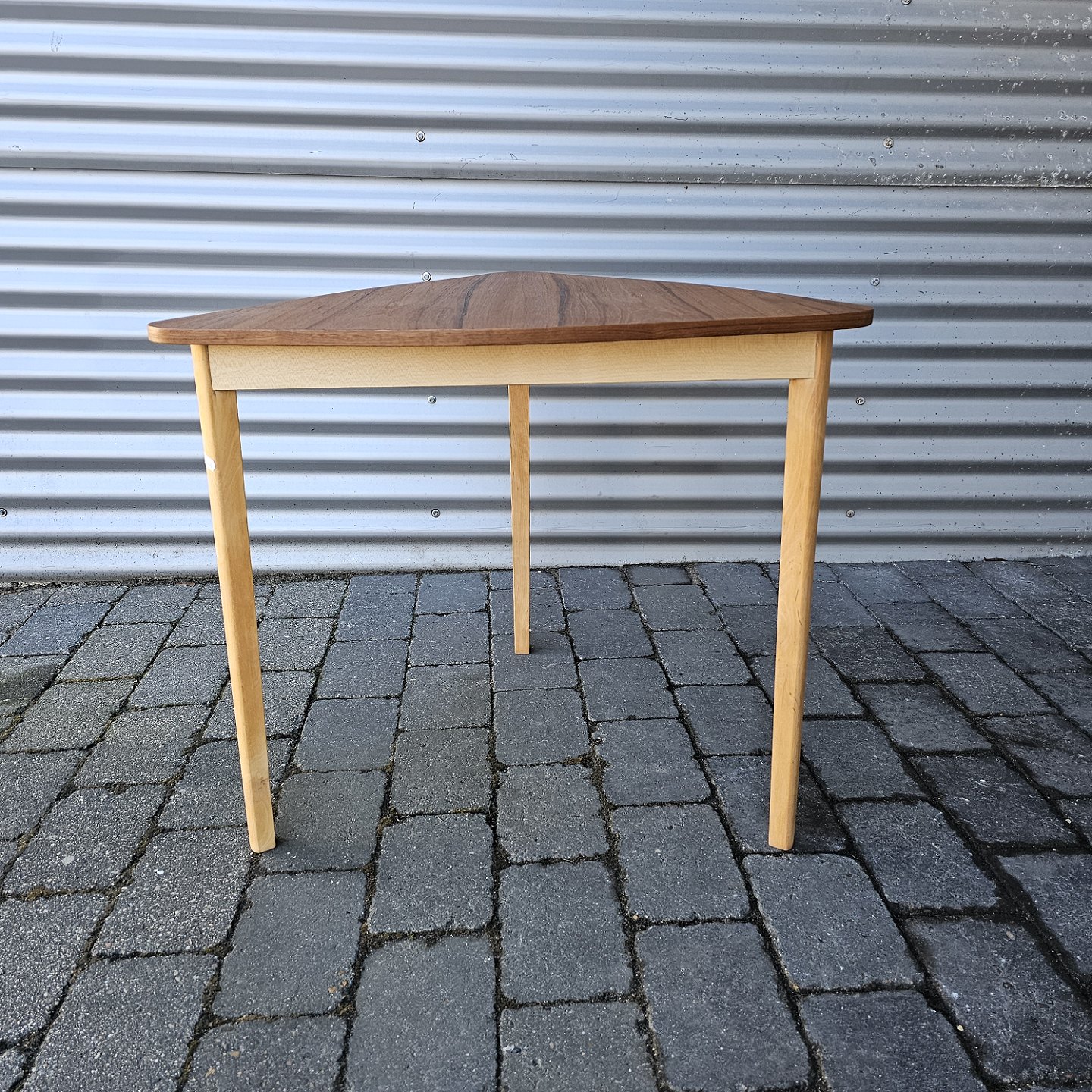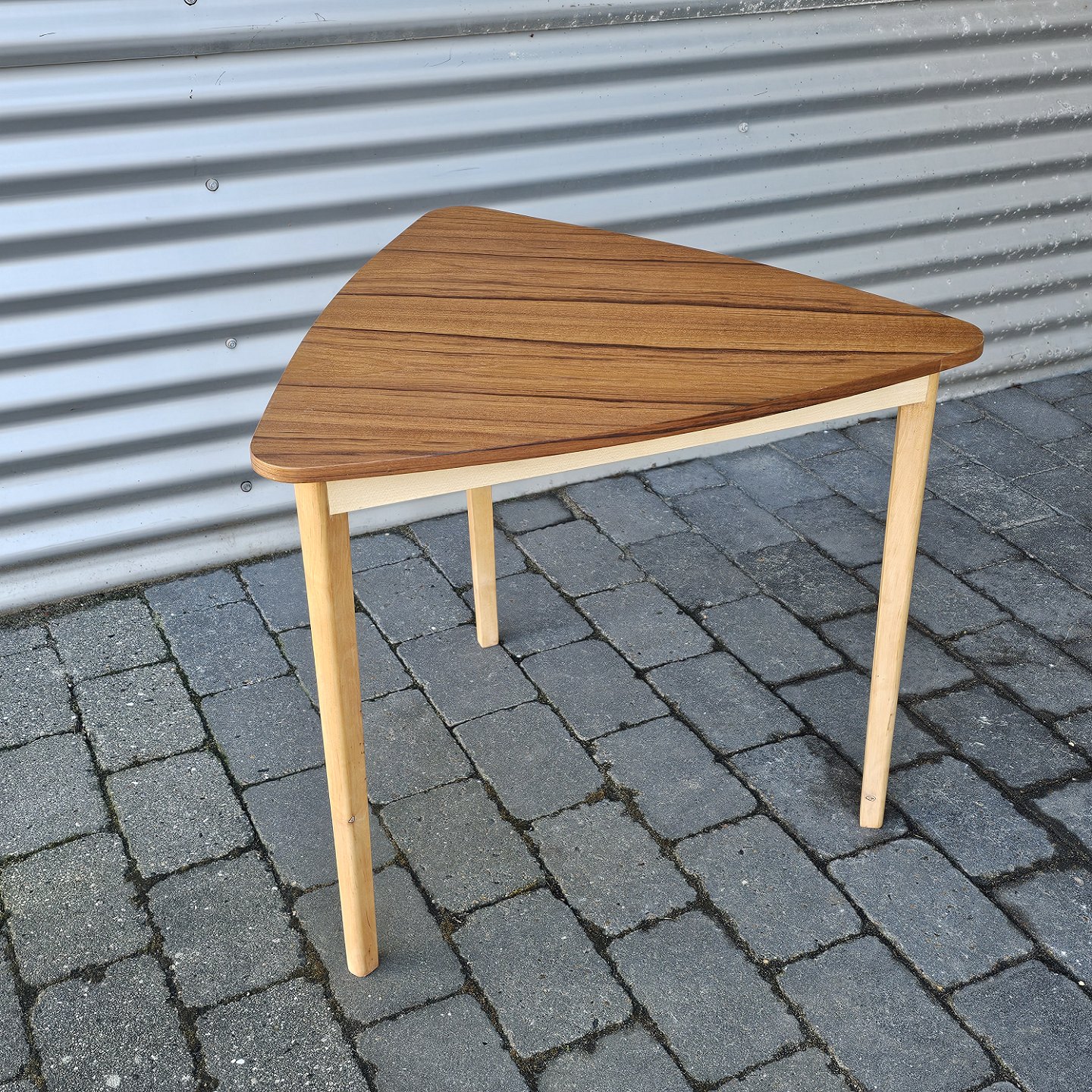 Trekantet sofabord med stel i bøg og bordplade i teaktræProducent ukendt