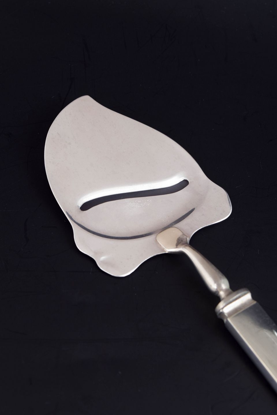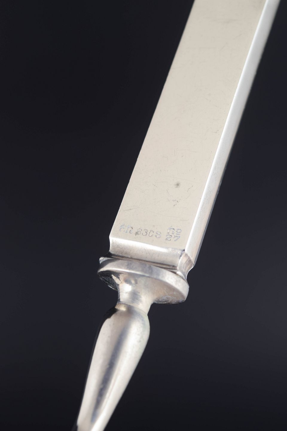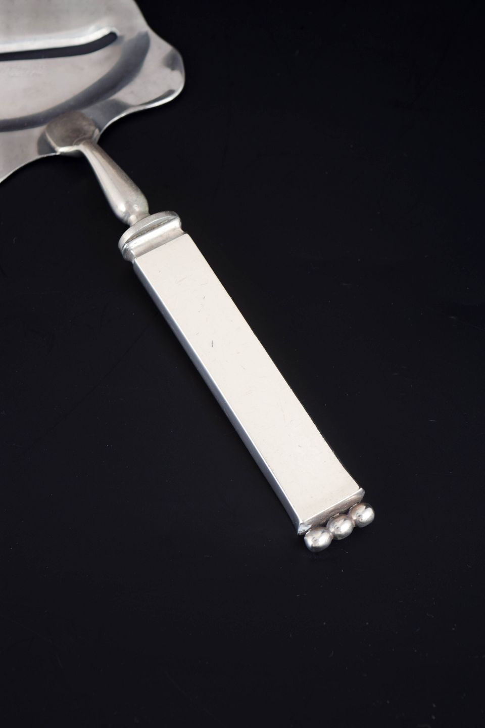 Evald Nielsen ostehøvl. Model nummer 27.Art deco ostehøvl i tretårnet sølv og rustfrit stål. Model nummer 27 med dekorativt skaft i relief med stiliseret blomstermotiv. Fremstillet hos Evald Nielsen.