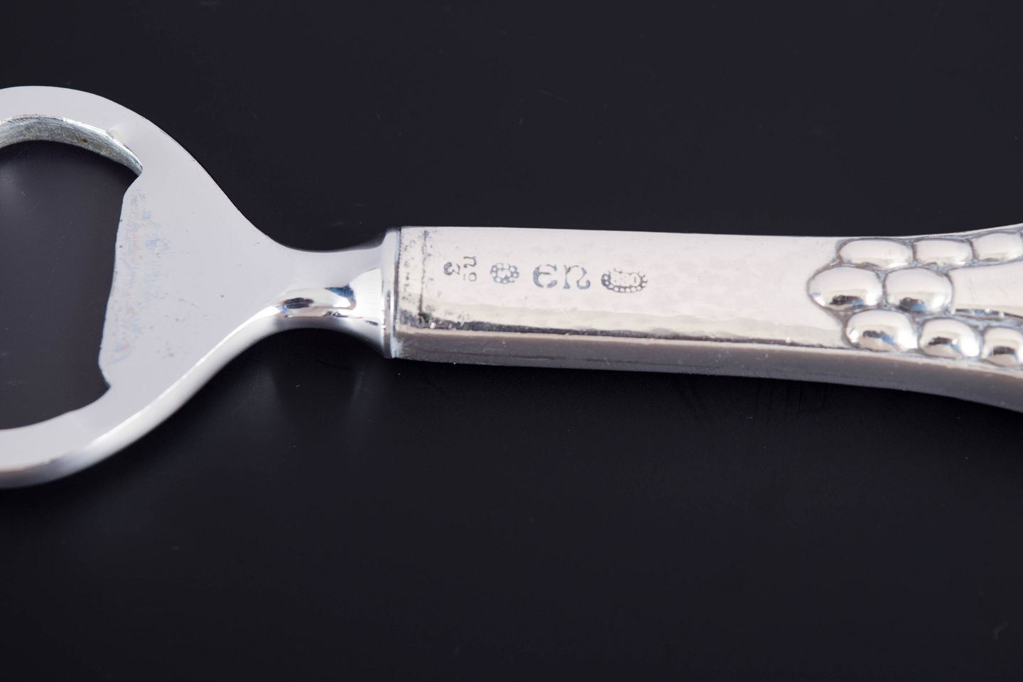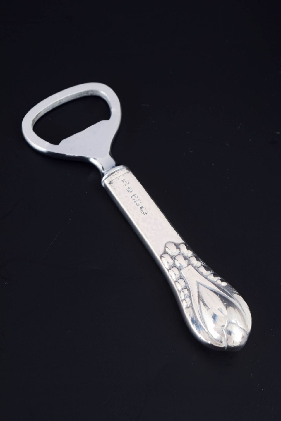 Evald Nielsen flaskeåbner. Model nummer 3.Art deco flaskeåbner i tretårnet sølv og rustfrit stål. Model nummer 3 med enkel, geometrisk skaftform typisk for perioden. Fremstillet hos Evald Nielsen.