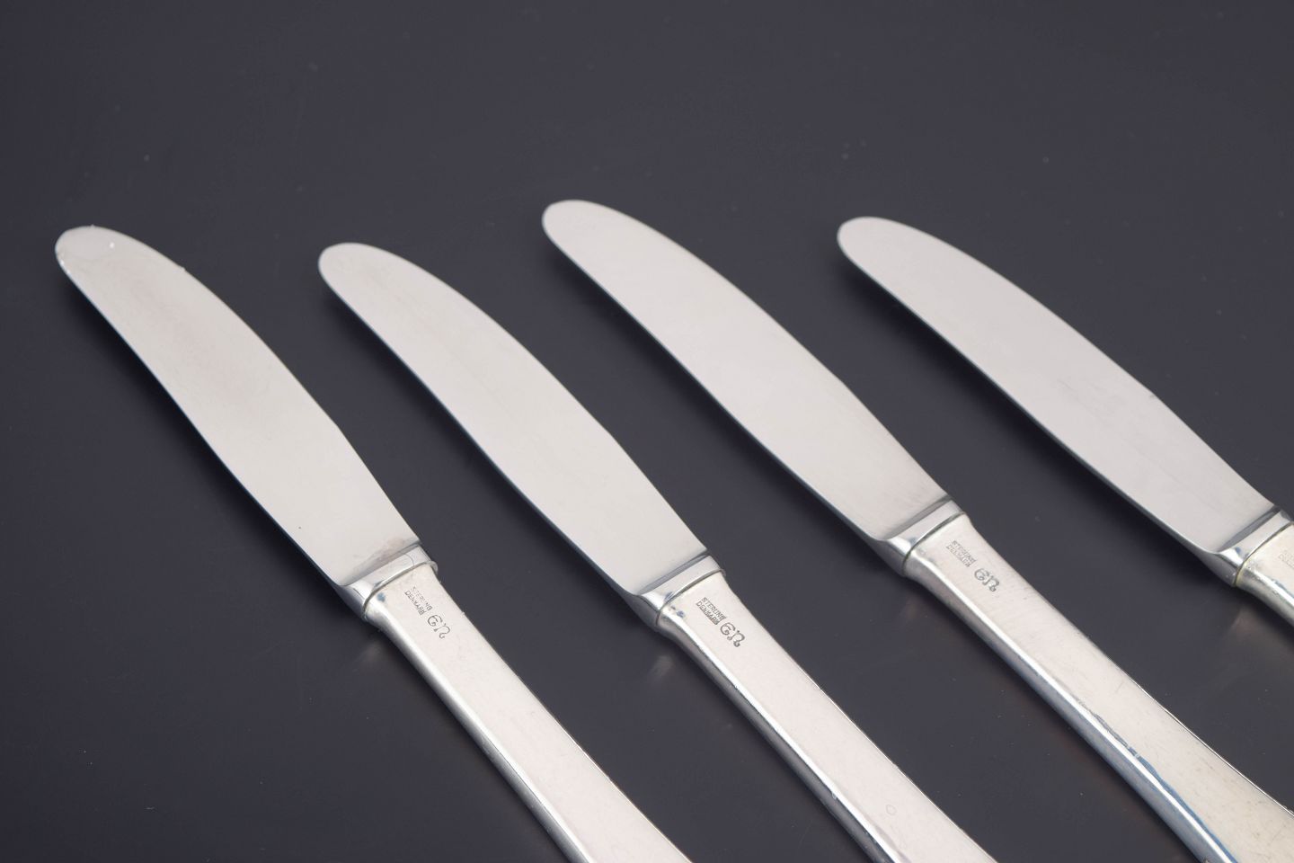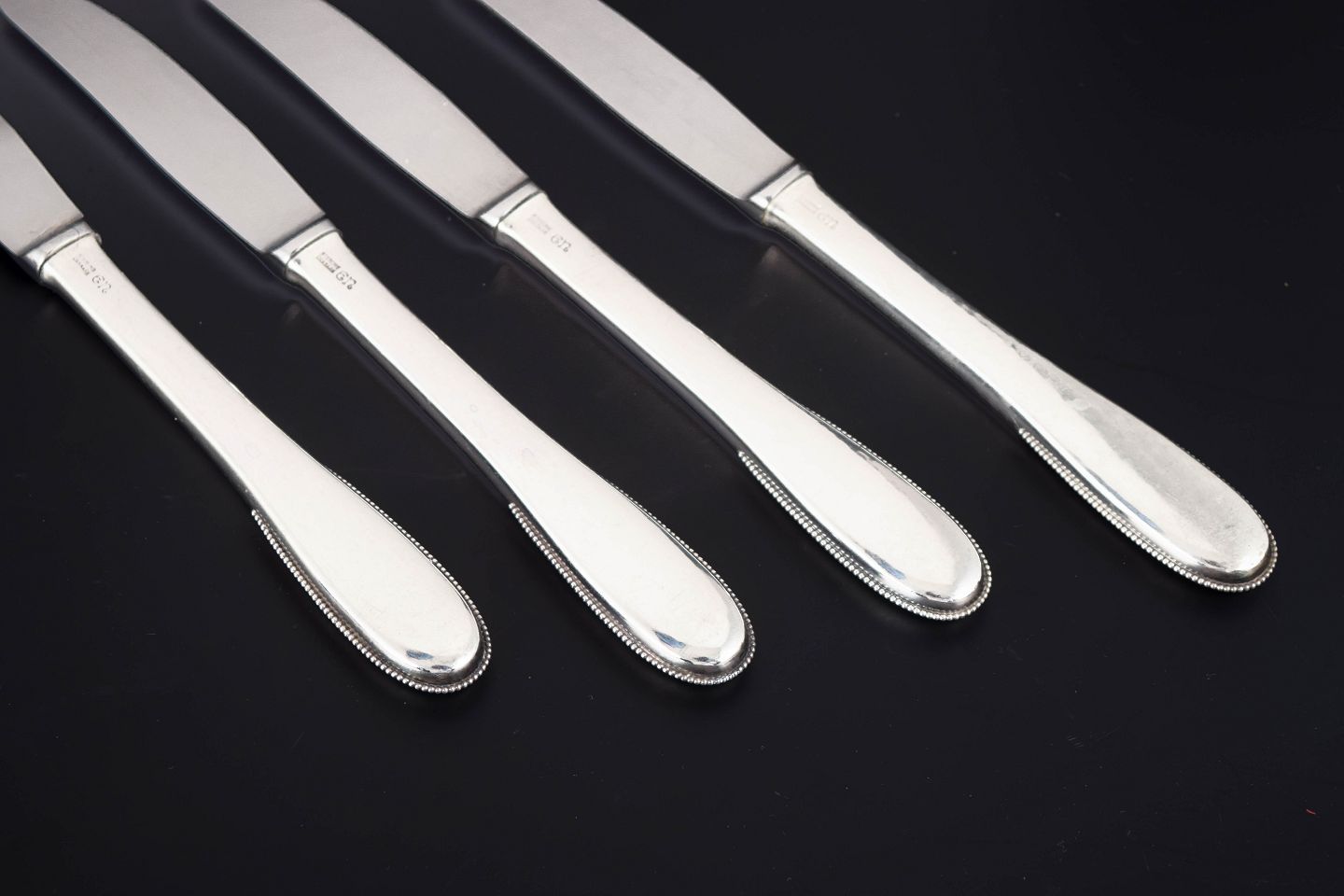 Evald Nielsen, fire frokostknive. Model nummer 14.Elegante frokostknive i sterlingsølv og rustfrit stål. Model nummer 14 med klassisk, let afrundet skaftform med diskret perlekant og glat klinge. Fremstillet hos Evald Nielsen.