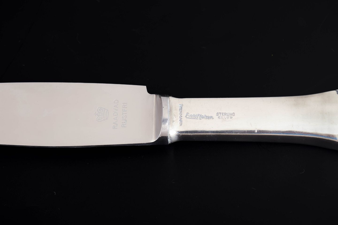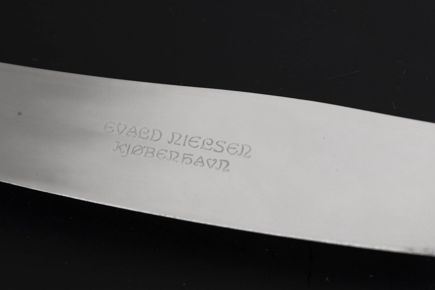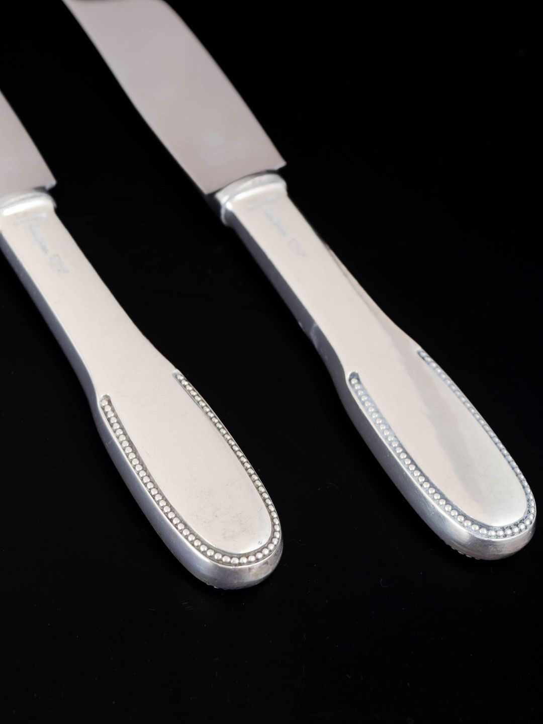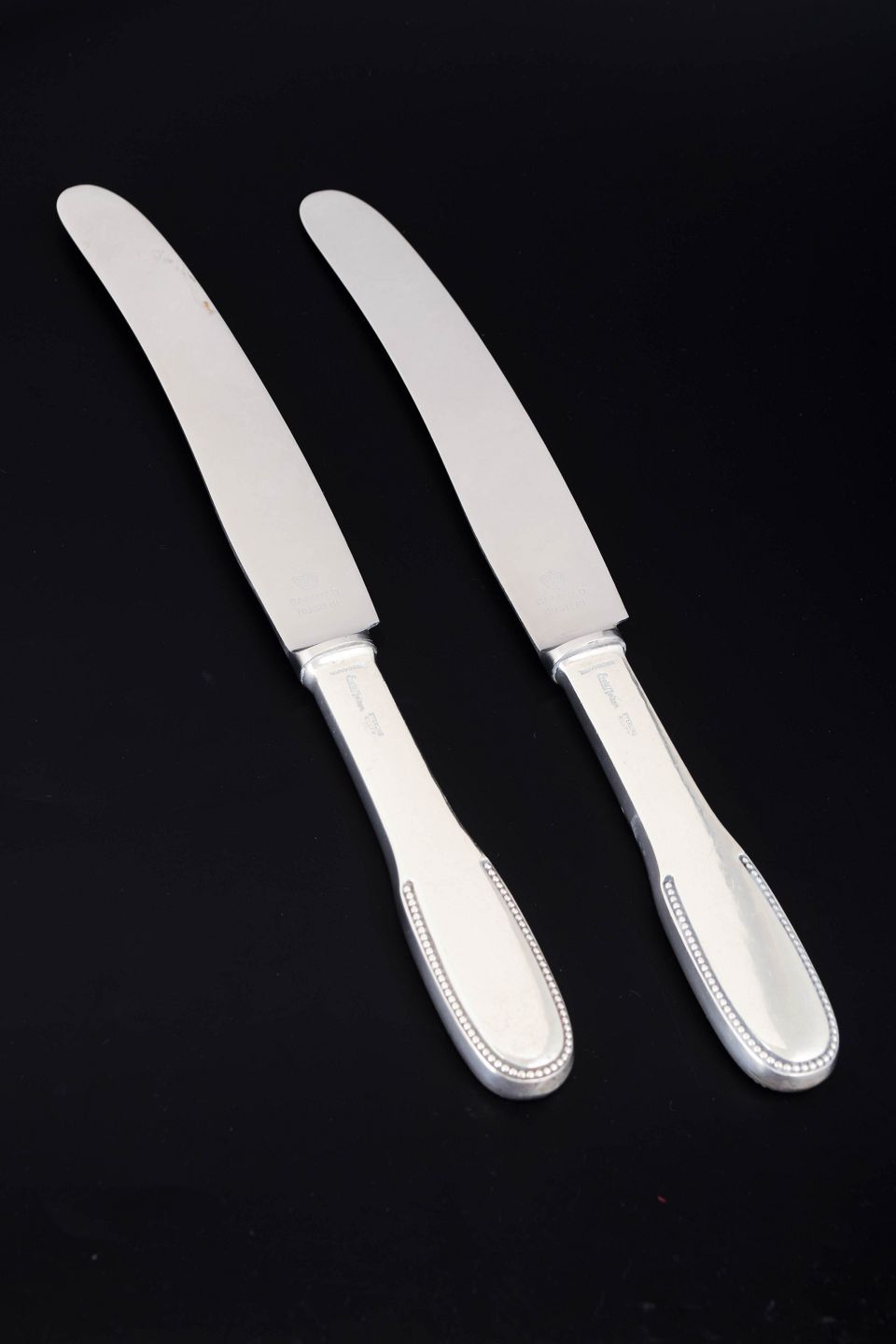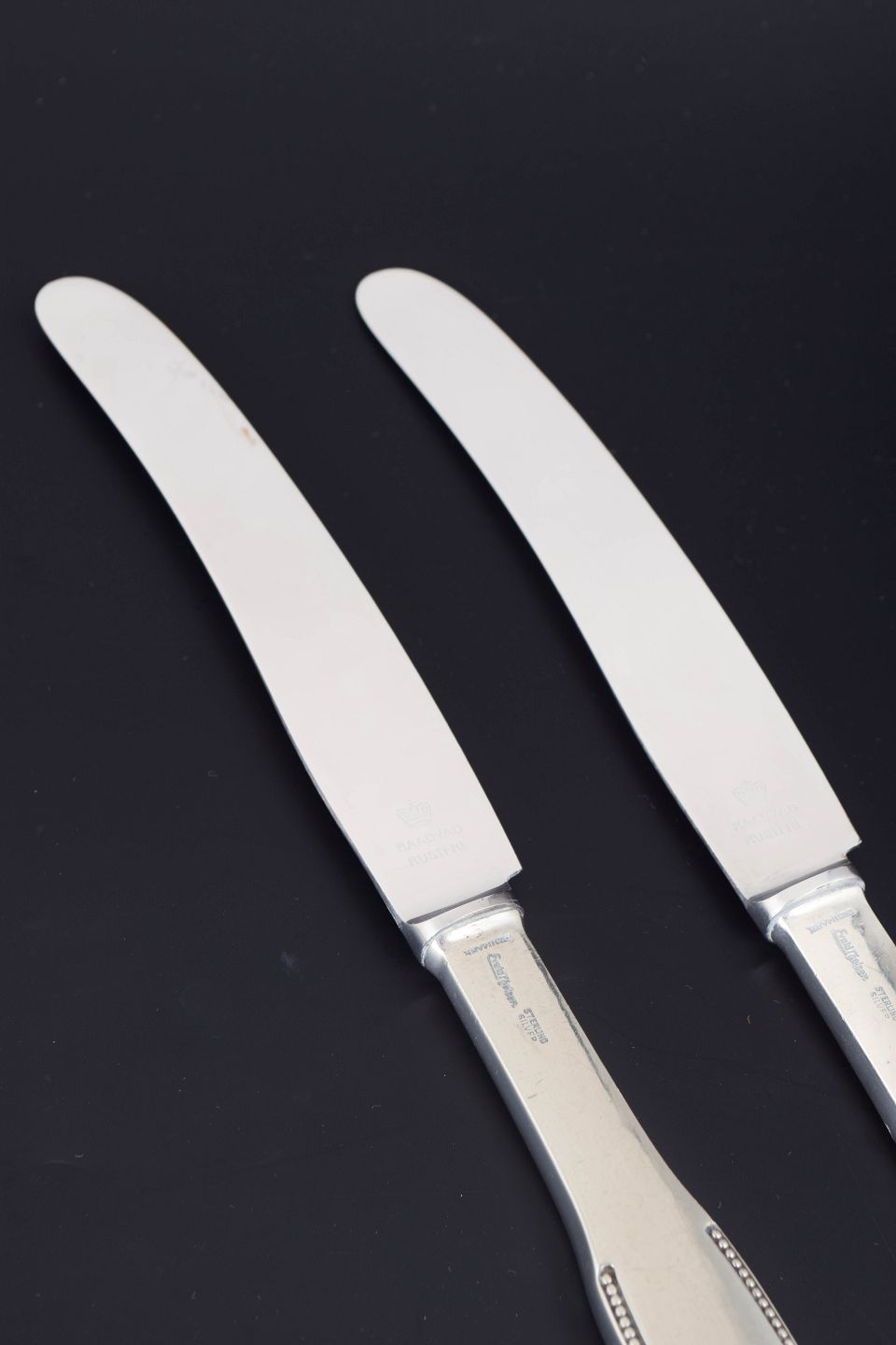 Evald Nielsen, to middagsknive. Model nummer 14.Elegante middagsknive i sterlingsølv og rustfrit stål. Model nummer 14 med klassisk, let afrundet skaftform med diskret perlekant og glat klinge. Fremstillet hos Evald Nielsen.