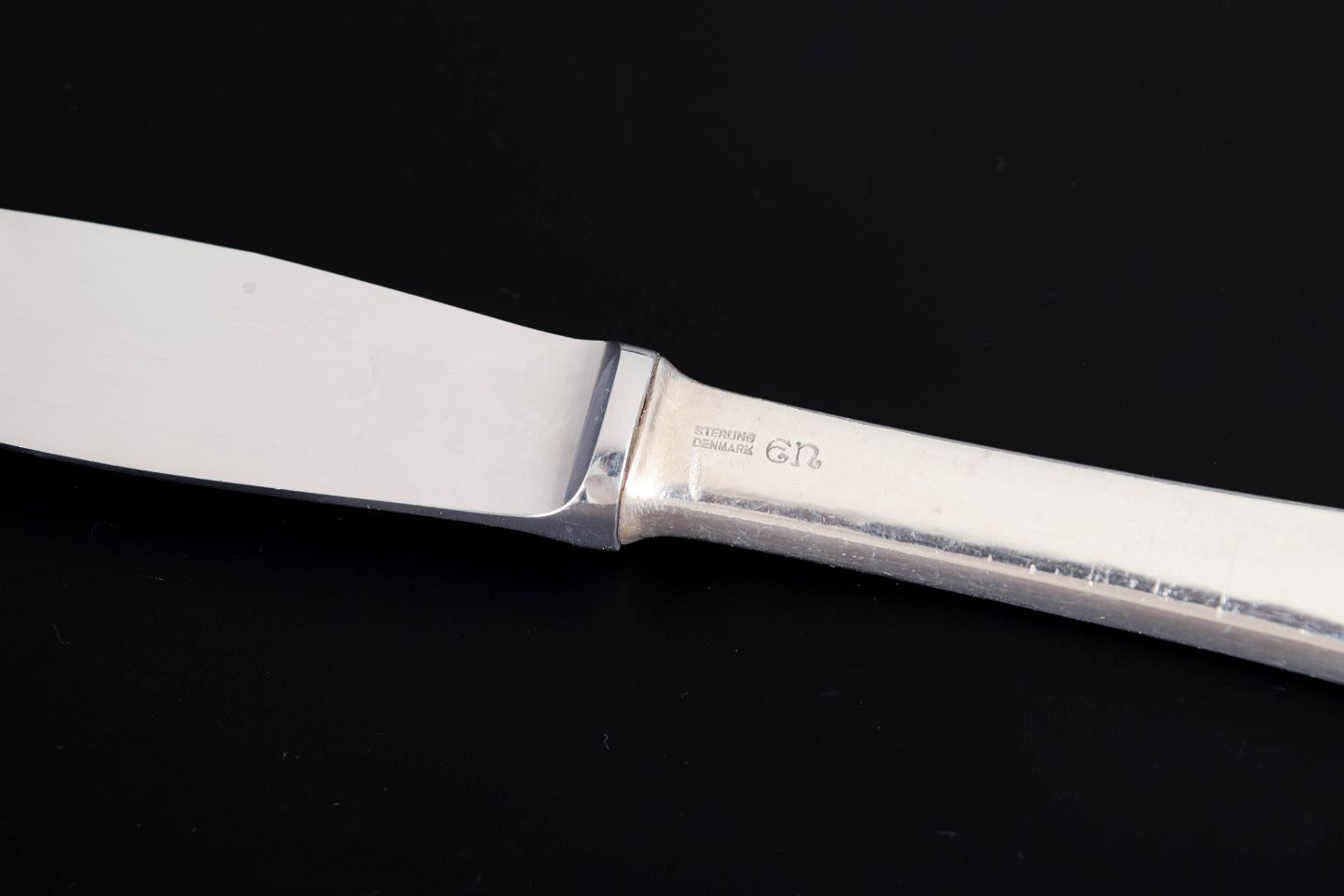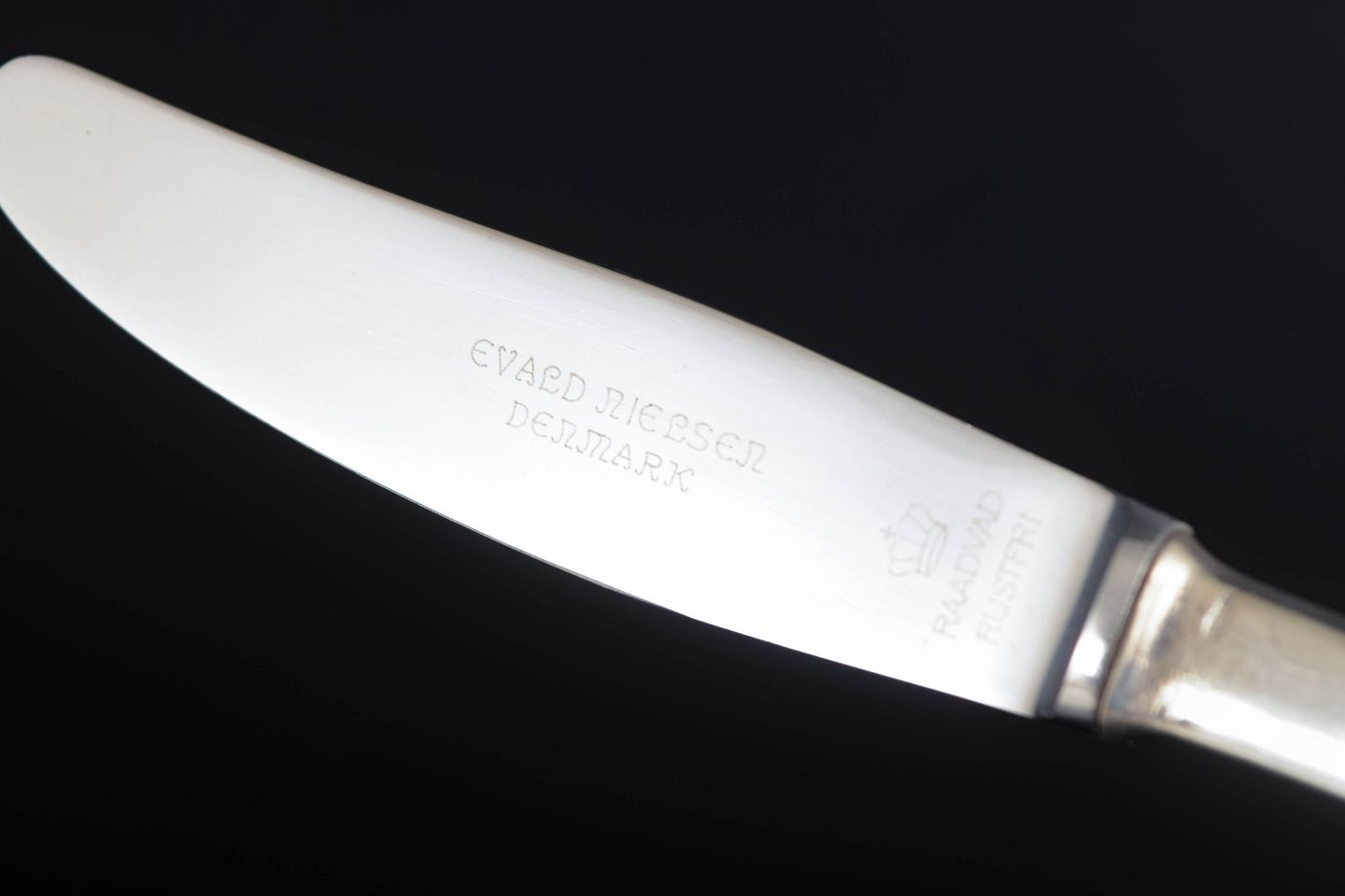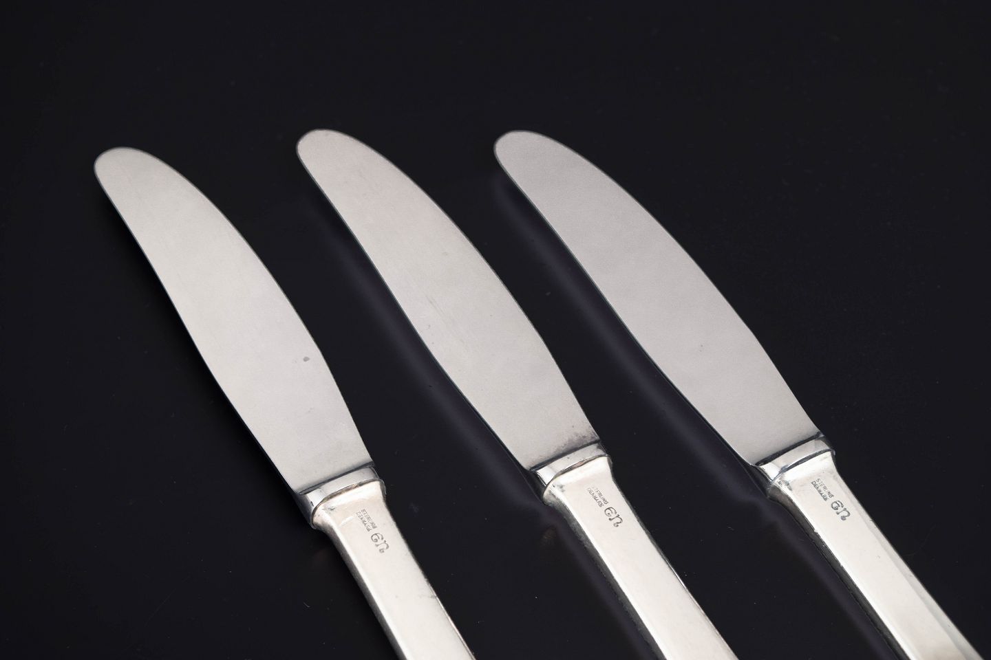 Evald Nielsen, tre middagsknive. Model nummer 14.Elegante middagsknive i sterlingsølv og rustfrit stål. Model nummer 14 med klassisk, let afrundet skaftform med diskret perlekant og glat klinge. Fremstillet hos Evald Nielsen.