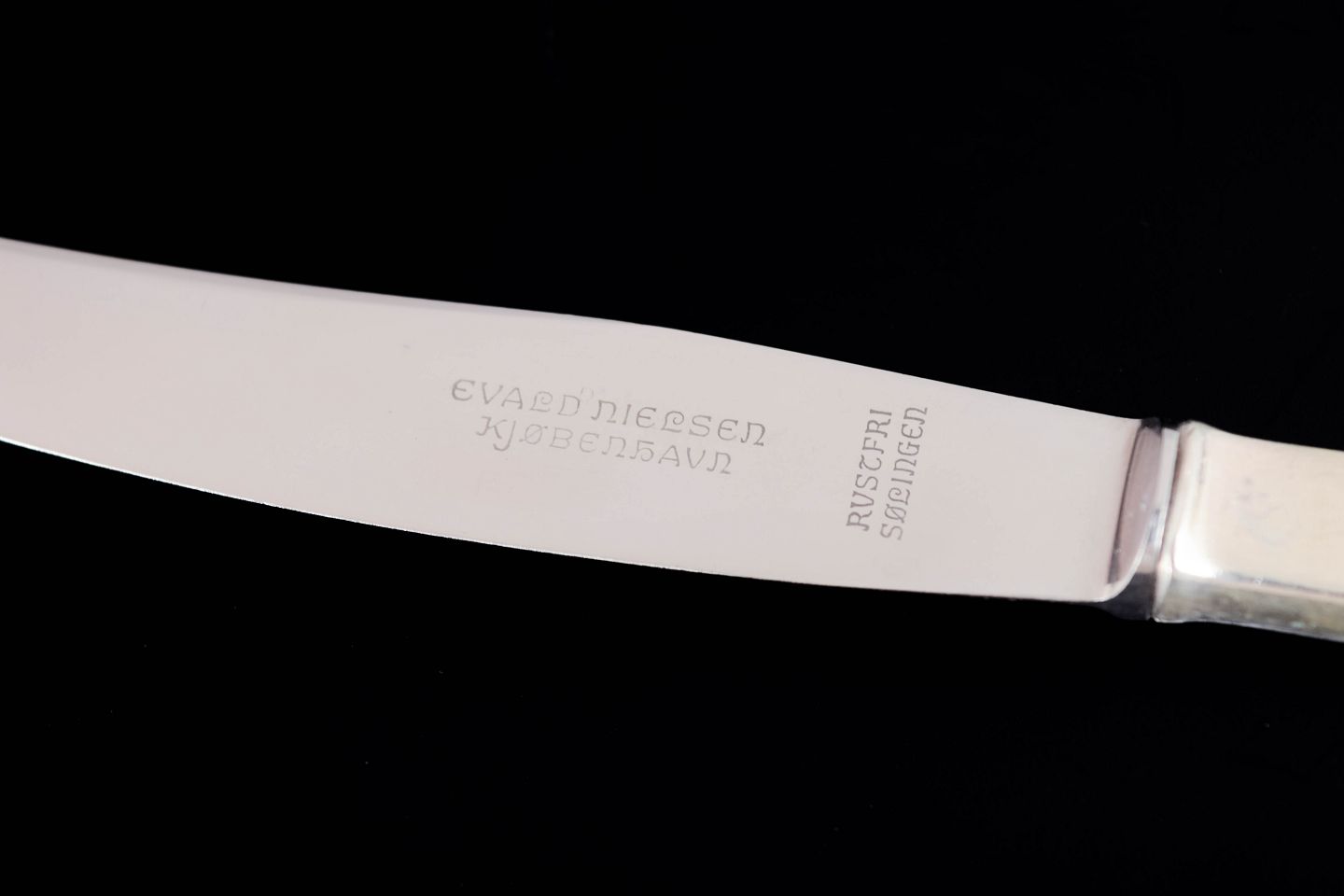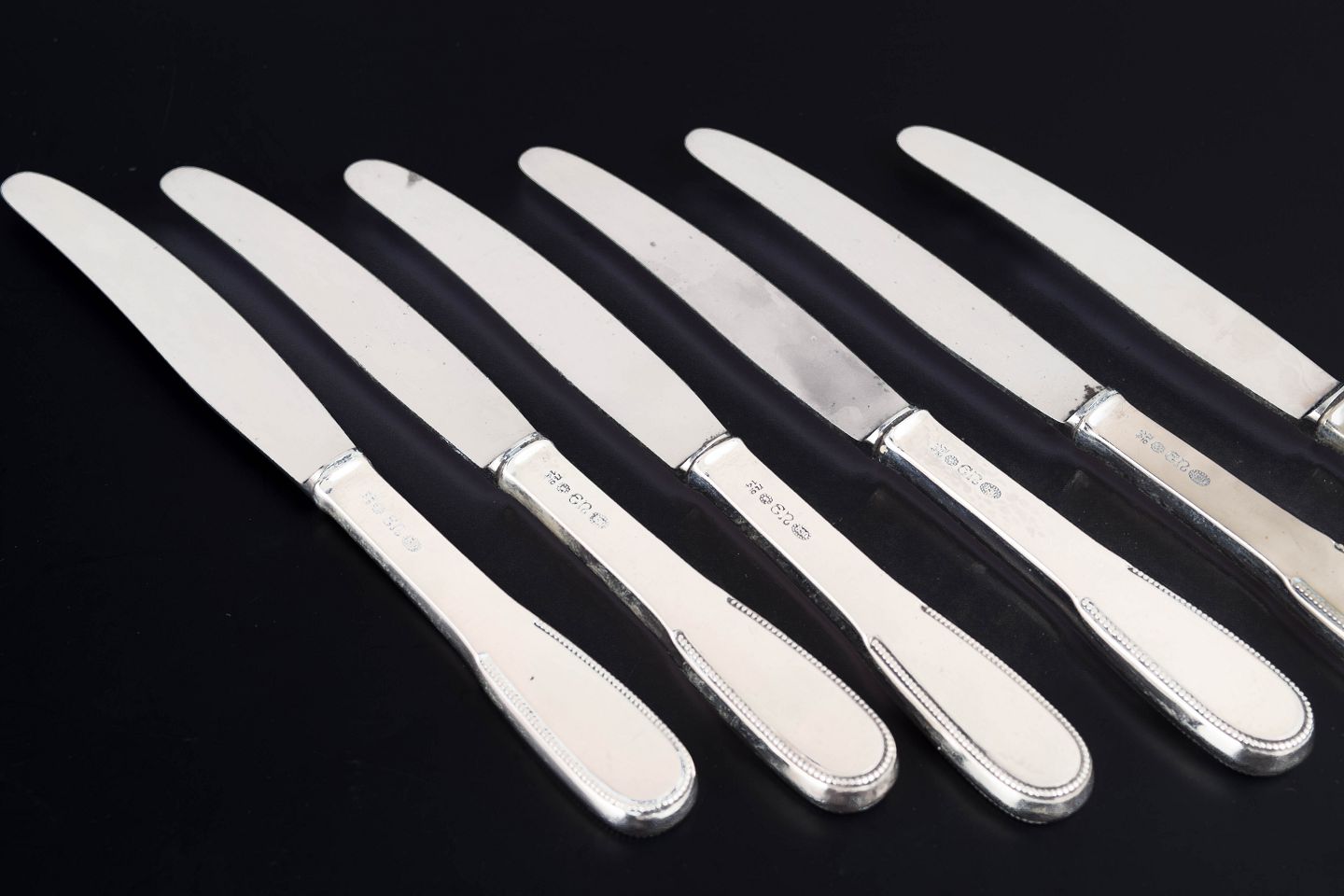 Evald Nielsen frokostknive, sæt af seks. Model nummer 14.Elegante frokostknive i tretårnet sølv og rustfrit stål. Model nummer 14 med klassisk, let afrundet skaftform med diskret perlekant og glat klinge. Fremstillet hos Evald Nielsen.
