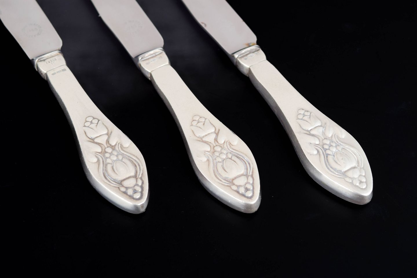 Georg Jensen, sæt af tre frugtknive, Klokke.Sæt af tre frugtknive i rustfrit stål og sterlingsølv i mønstret Klokke fra Georg Jensen. Skaftet er dekoreret med et stiliseret blomstermotiv inspireret af fuchsiaen, udført i relief med bløde organiske linjer, karakteristisk for Georg Jensens tidlige jugendstil.