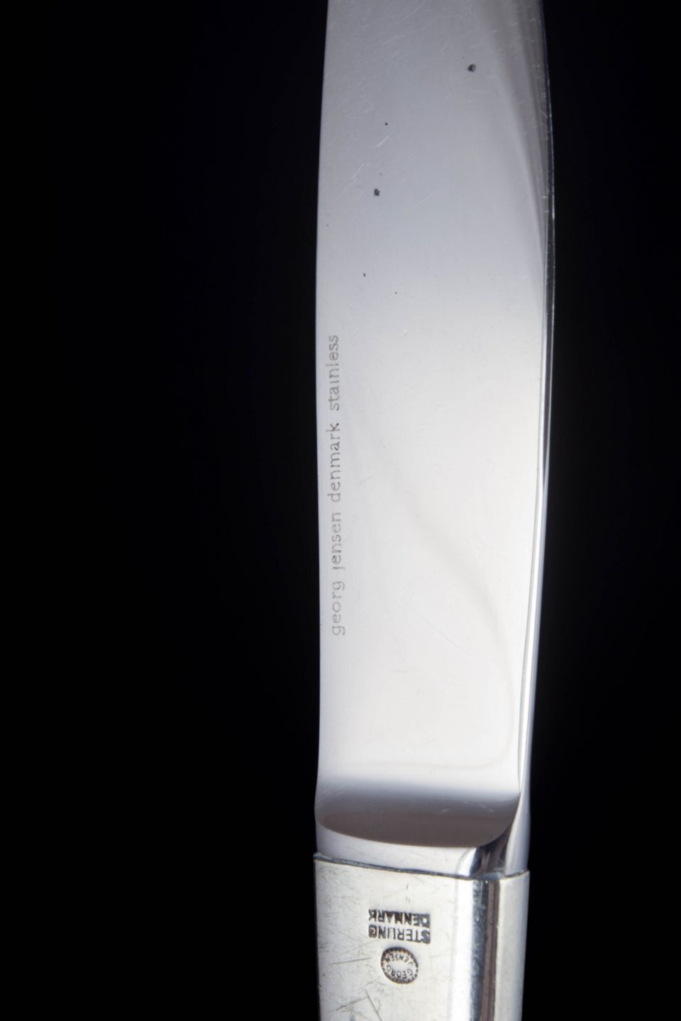 Henning Koppel for Georg Jensen, to frokostknive Caravel.To frokostknive i rustfrit stål og sterlingsølv i modellen Caravel, designet af Henning Koppel for Georg Jensen. Bestikket er udført i et stramt og elegant formsprog med slanke linjer og let konisk form, karakteristisk for Koppels modernistiske design.