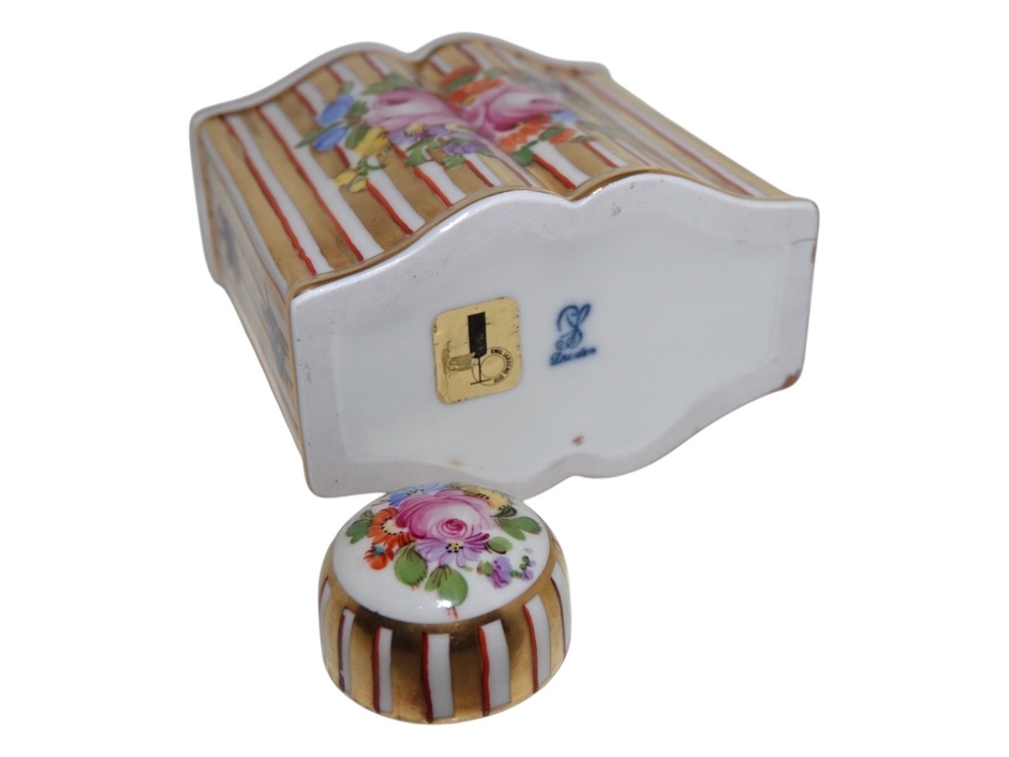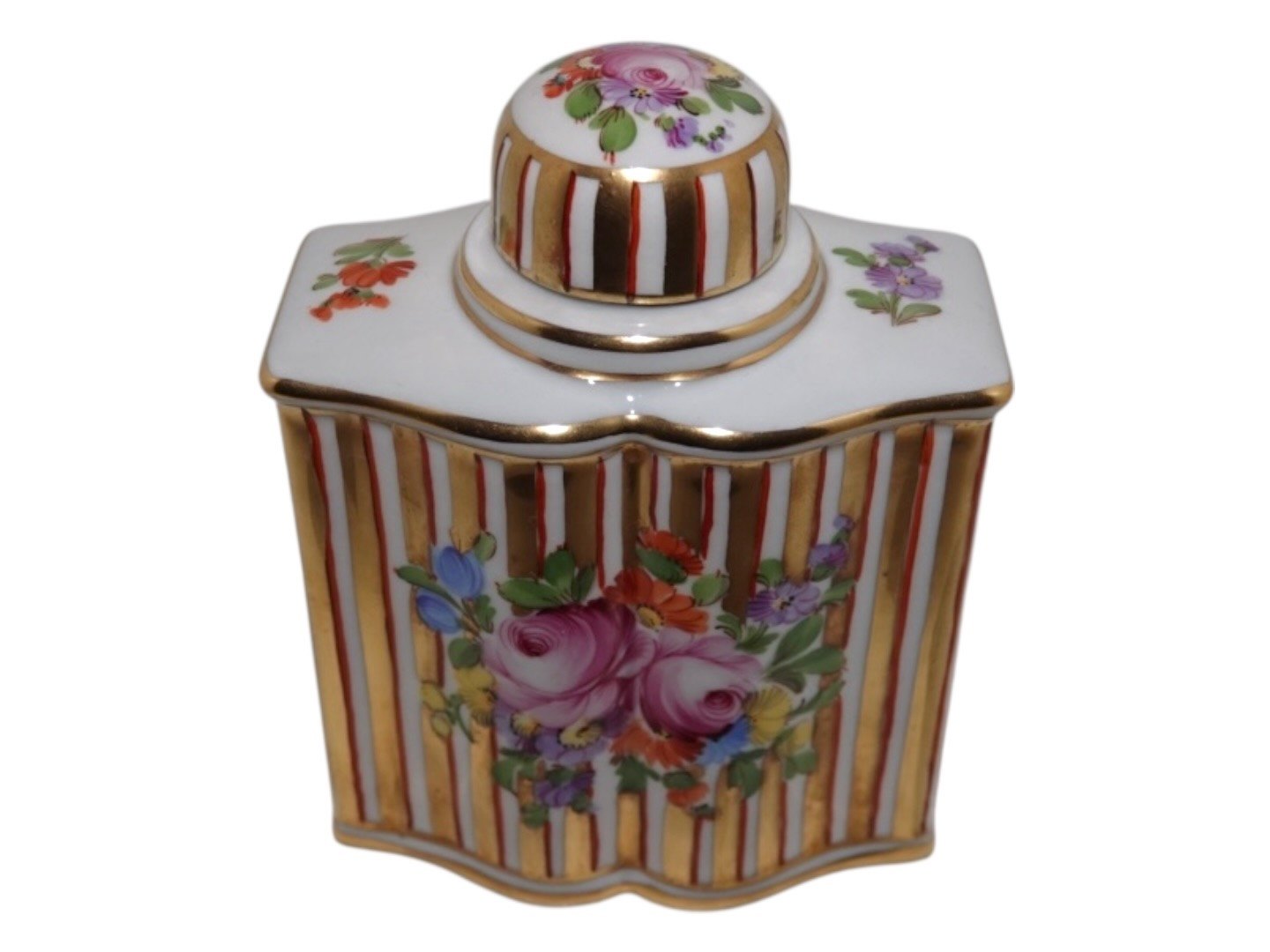 Dresden porcelæn, tedåse med Saksisk Blomst dekoration.Højde 13,0 cm., bredde 10,0 cm.