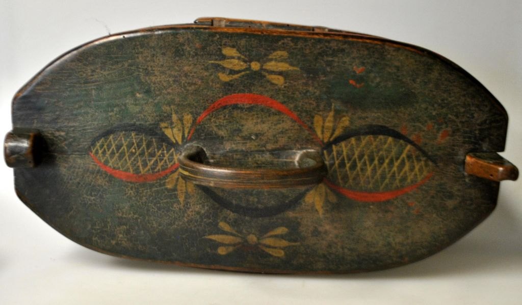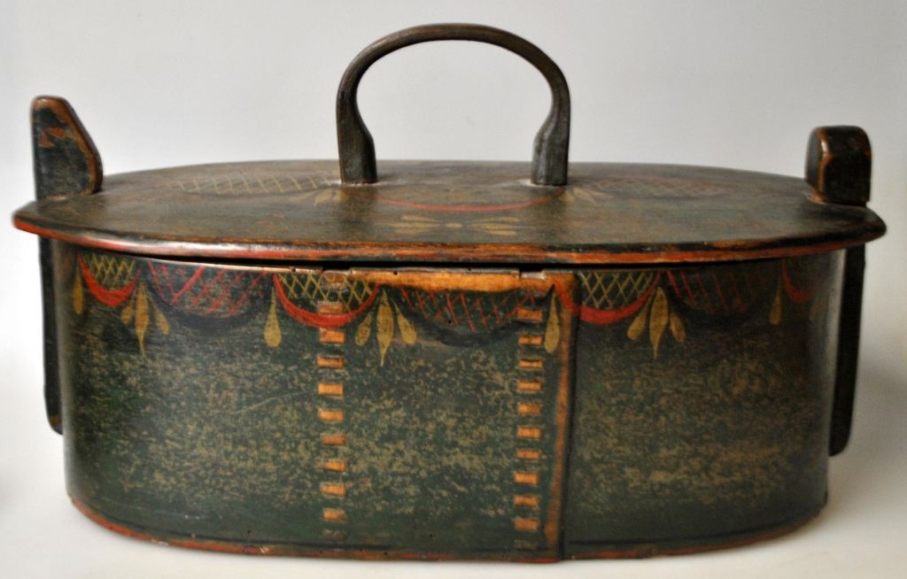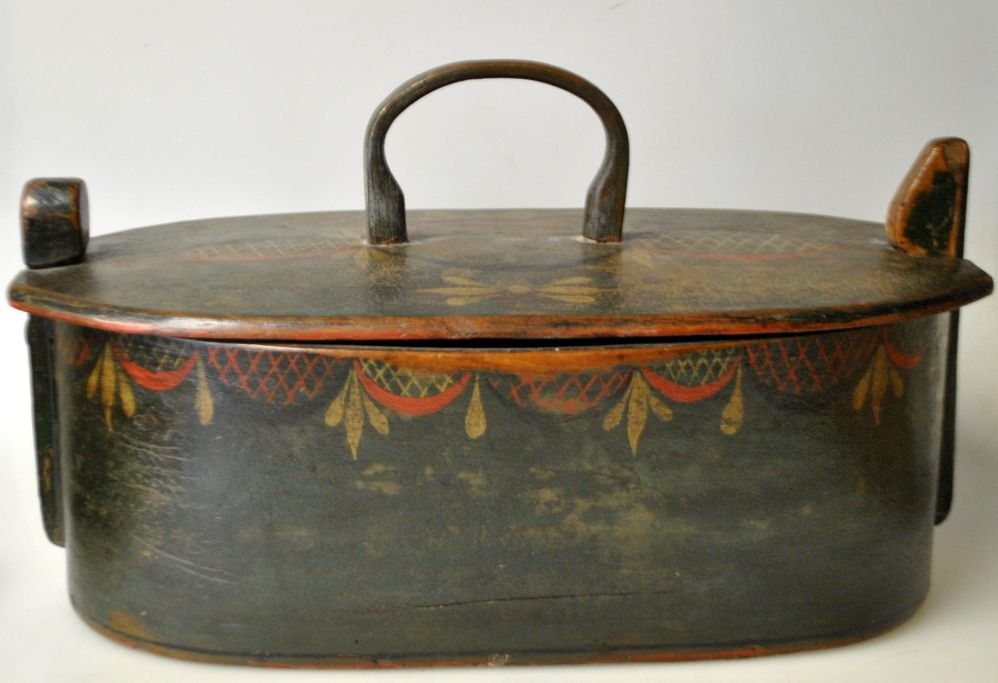 Tejne madkasse i træ med låg, ca. 1820-1830, Danmark. Bemalet i grøn med rød og gylden dekoration. H. inkl. hank: 19,5 cm. L: 34 cm. B: 18 cm.Emne nummer: 29056