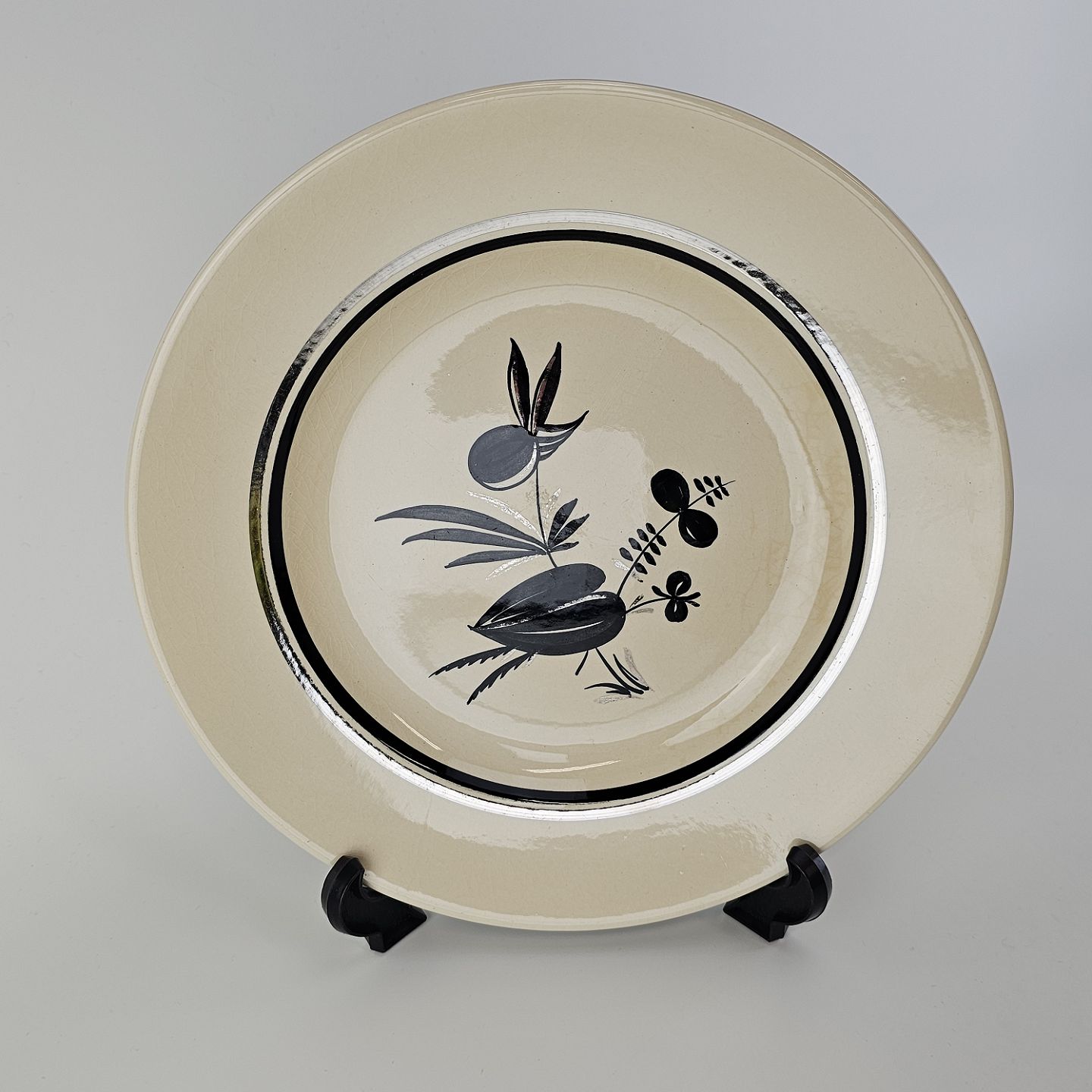 Råhvidt fajancestel i stelform E med dekoration af naturmotiver i sølv og sort farve.