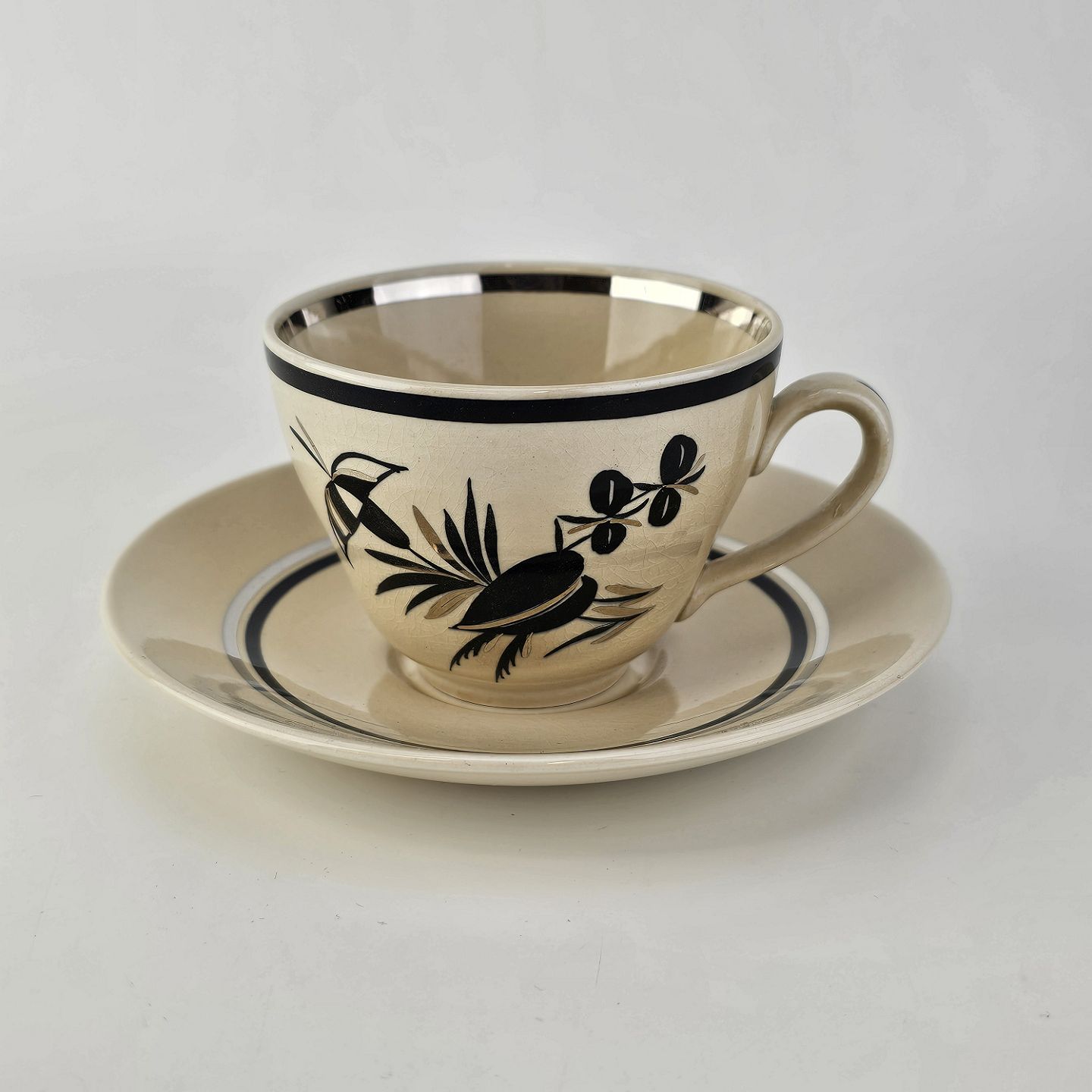 Kaffekop med underkop i fajance fra stellet Dragsholm fremstillet i perioden 1934-1965.Nr. 2064
