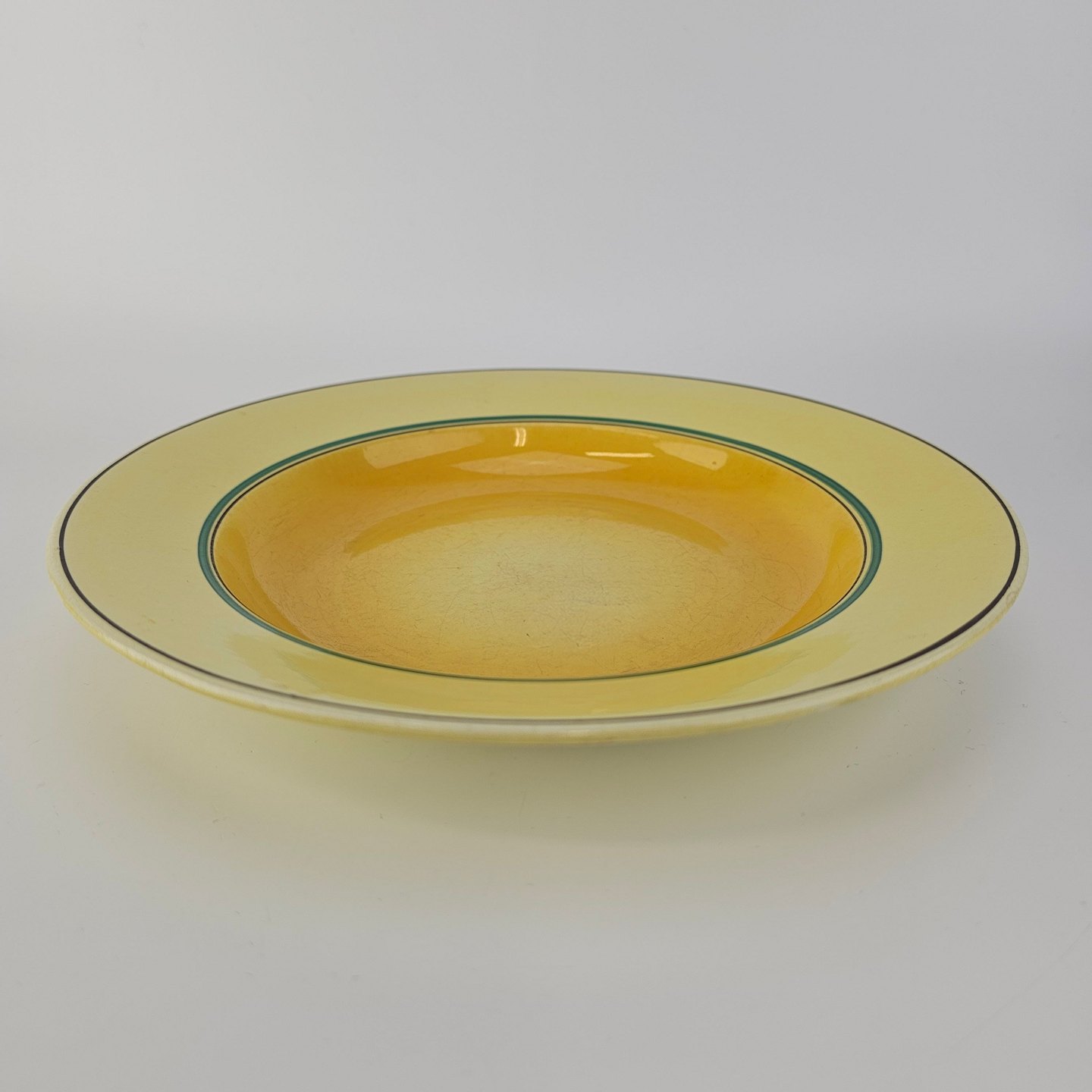 Fajancestel i stelform C med dekoration i gule nuancer med grøn stribe.