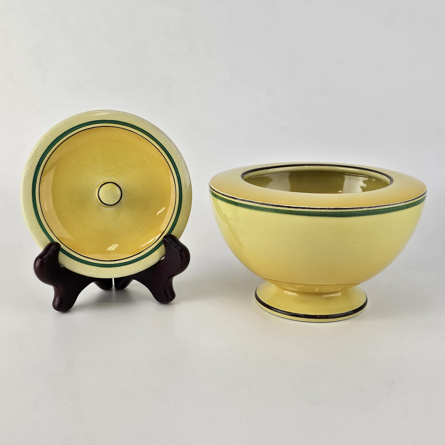 Sukkerskål med låg i fajance fra stellet Gertrud fremstillet i perioden 1933-1939.Formgiver Nils Thorsson