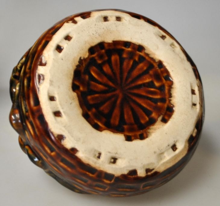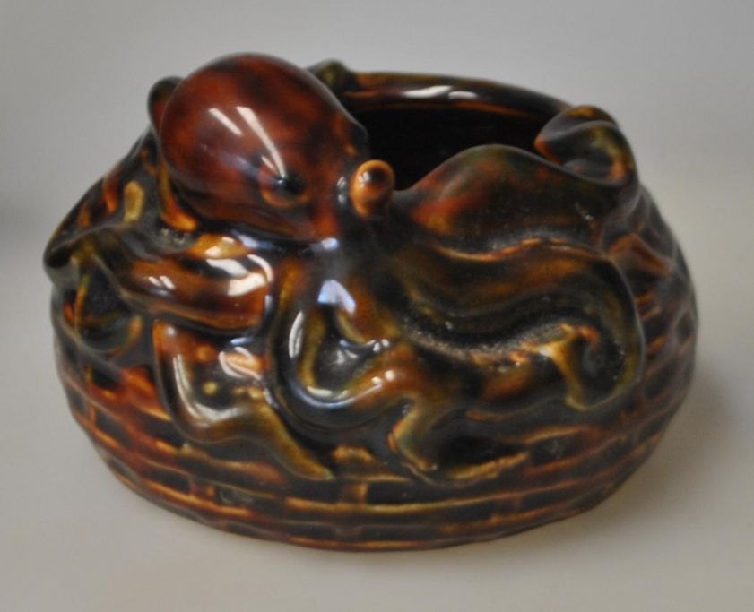Fajance skål, ca. 1900. Brunglaseret. Dekoreret med en blæksprutte ved en kurv. H.: 7,5 cm. Dia.: 12,5 cm.Emne nummer: 29074