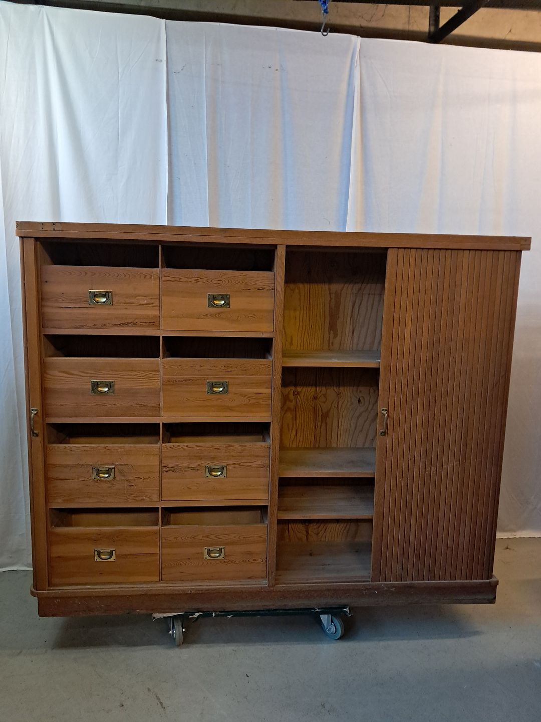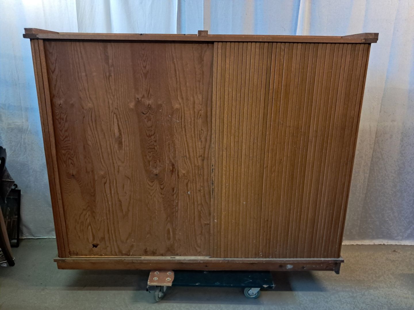 Jalousiskab i fineret egetræ, fra 1950erne.Det har brugsspor og defekte jalousilåge.