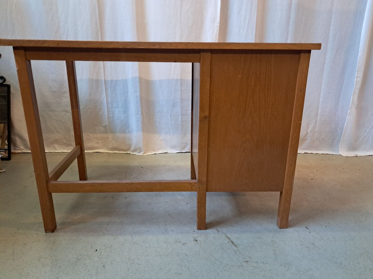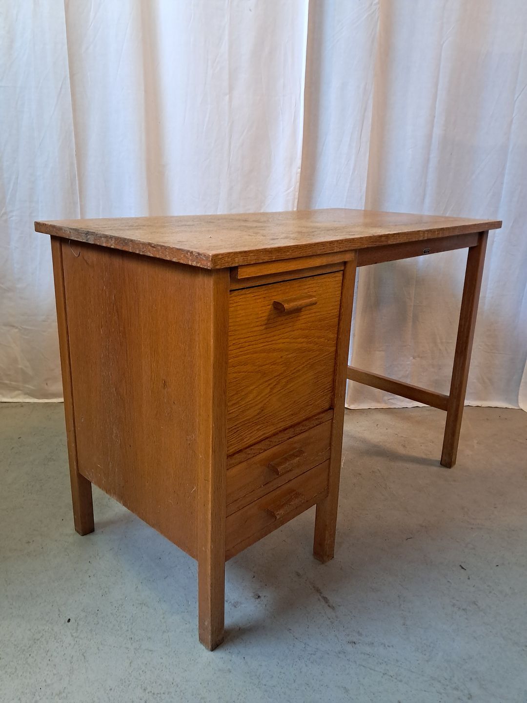 Børne skrivebord i fineret egetræ, fra 1950erne.Det har brugsspor.